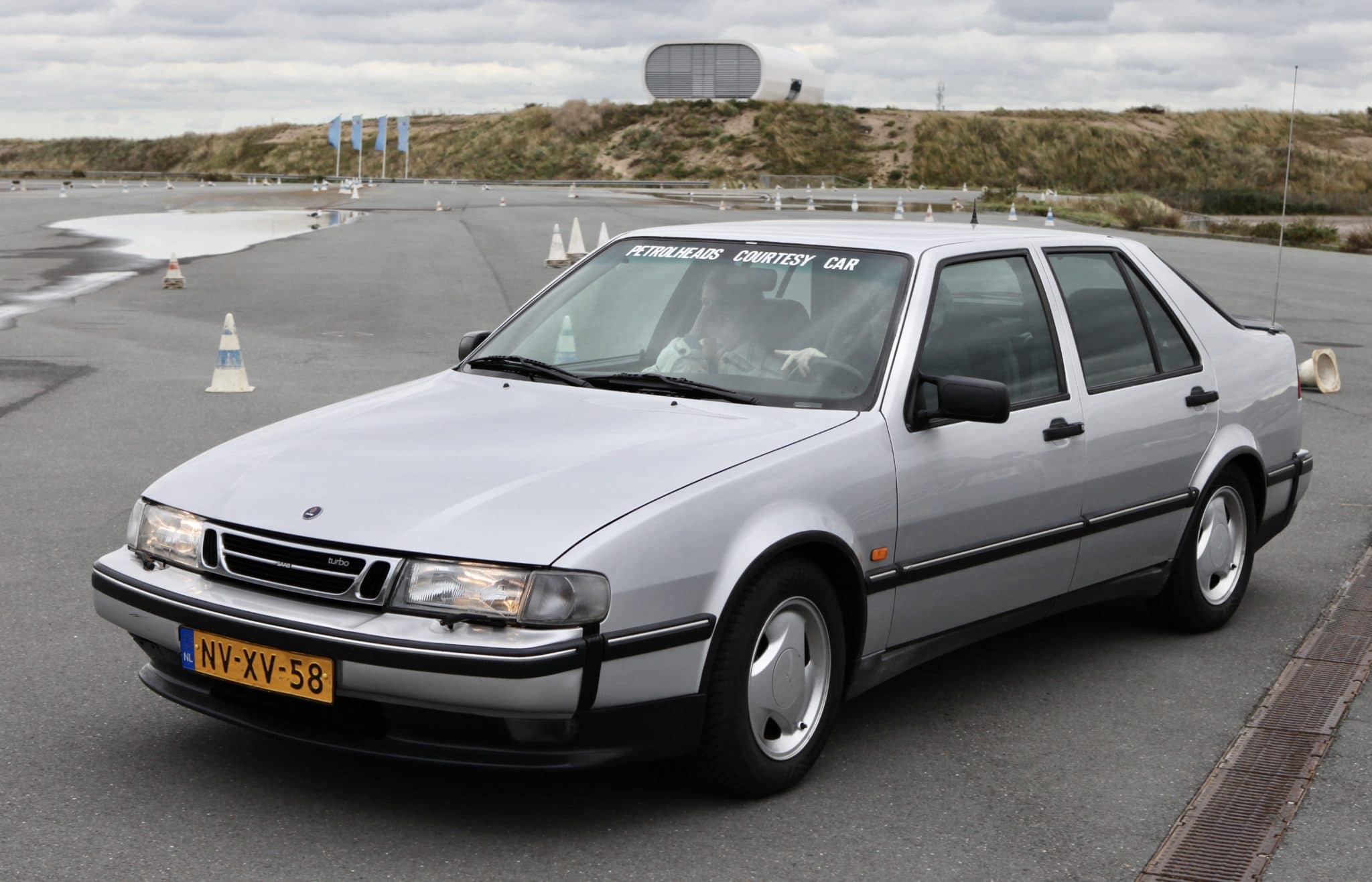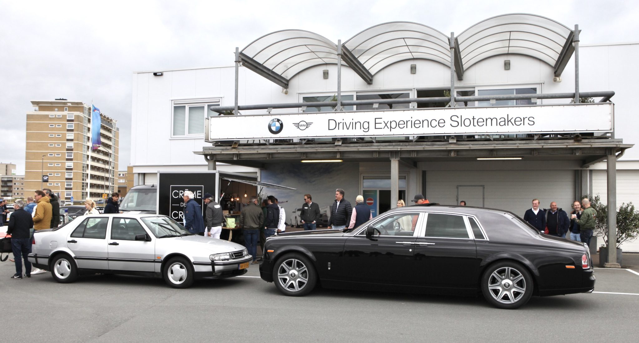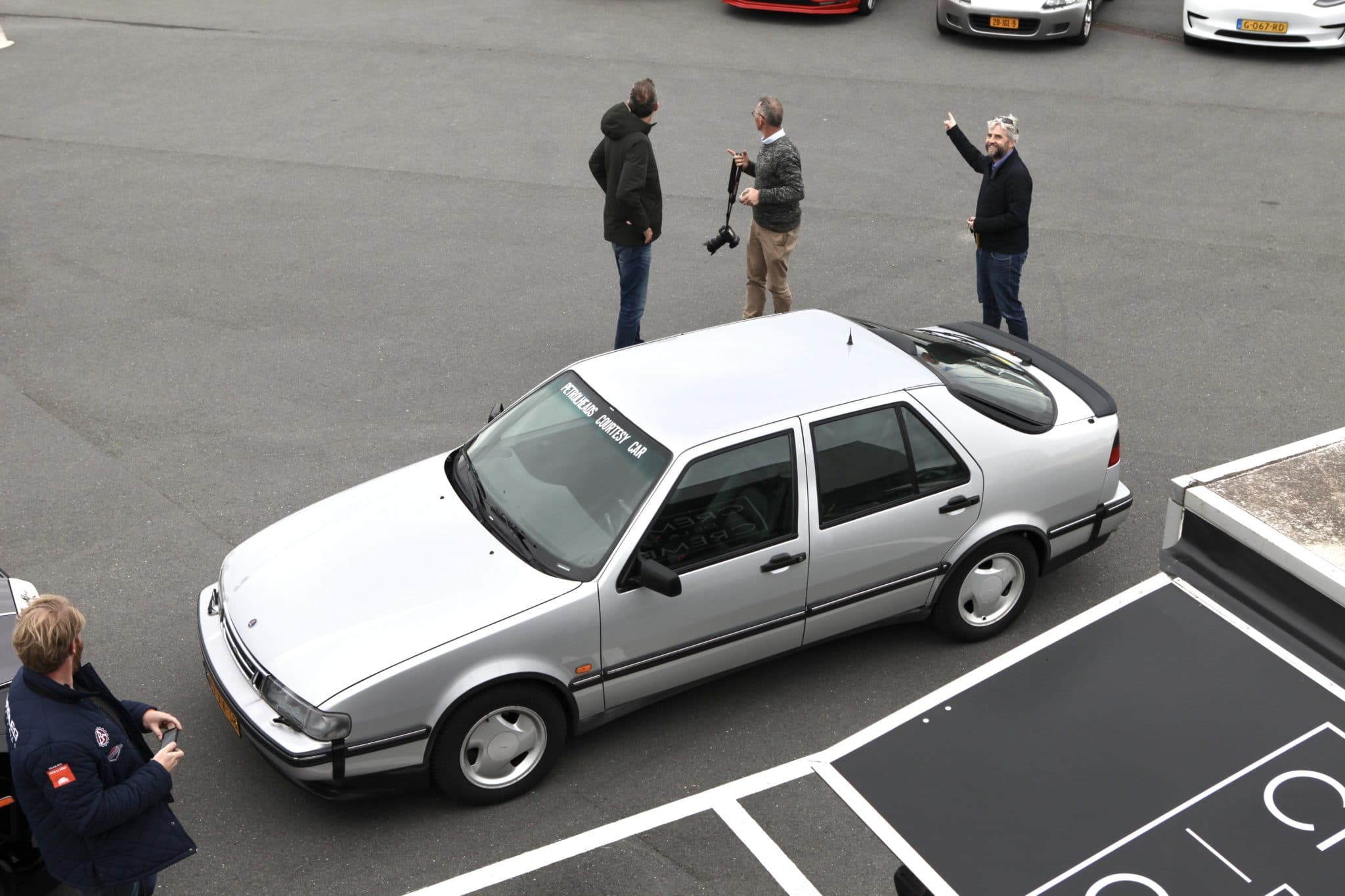 Op het parkeerterrein staat een mix van moderne auto’s en klassiekers. Ik pik er een paar uit.De courtesycar, het knuffeldier van de BNR Petrolheads, pronkt. Jorn Lucas heeft de auto naar Zandvoort gereden. Deze SAAB 9000 met 355.000 kilometer op de teller. Deze wordt door Brantsen en Van Werven in de watten gelegd, en als nieuw gemaakt. Een mooie en héél late Talbot-Simca 2 Litres wint later op de middag de prijs voor de meest bijzondere auto. Net even anders, een tikje onverwacht, passend bij het programma. Verder is er de immense Rolls Royce, waarmee Ronald Dubbelman de twee presentatoren bij het hoofdkantoor van BNR in Amsterdam oppikte. En een rijtje BMW 3-serie exemplaren wacht op het einde van de opname. Zij staan gereed voor diegenen die na de opname kortstondig en begeleid door een instructeur de kneepjes van sliptechniek mogen ervaren.