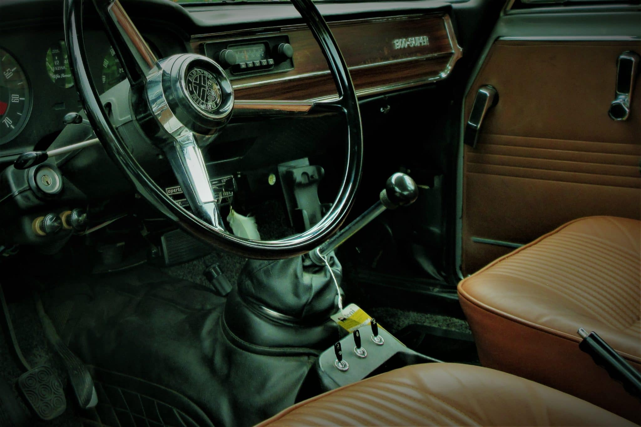 Tijdens de lunch praten wij over het oude Alfa, dat met gemengde gevoelens haar schaduw over het heden en de onzekere toekomst laat neerdalen. Binnen die schaduw zijn er nog steeds lichtpunten, de nieuwe Giulia van Koen bewijst nog steeds de verleidingskracht van het Milanese merk. Maar vandaag zegeviert de historie, en ik zegevier als Koen en ik voor een eerste impressie met zijn oude Giulia gaan rijden. De aanblik van zijn klassieke Alfa Romeo Giulia 1300 Super vormt de opmaat naar dat gevoel van victorie. Het Giulia design, het Grigio Medio, de prachtig bruine leren bekleding en de originele en peperdure magnesium GTA velgen vertellen waarom een auto kan betoveren.