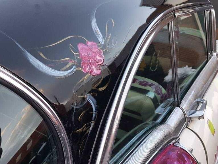 Dat kunt u letterlijk nemen, want deze edelcoupé werd twintig jaar geleden door een wereldwijd opererende kunstenaar vakkundig van een eigen en uniek gezicht voorzien. De Caddie werd met olieverf behandeld. Sierlijke en fijnzinnige tekeningen illustreren de van oudsher rood met witte Cadillac. Het resultaat is harmonisch, want telkens keren elementen op diverse plekken terug. Onder het toeziend oog van de nodige prominenten werd het kunstwerk onthuld. Zij zijn ongetwijfeld onder de indruk geweest van de symbiose van de beschilderingen.