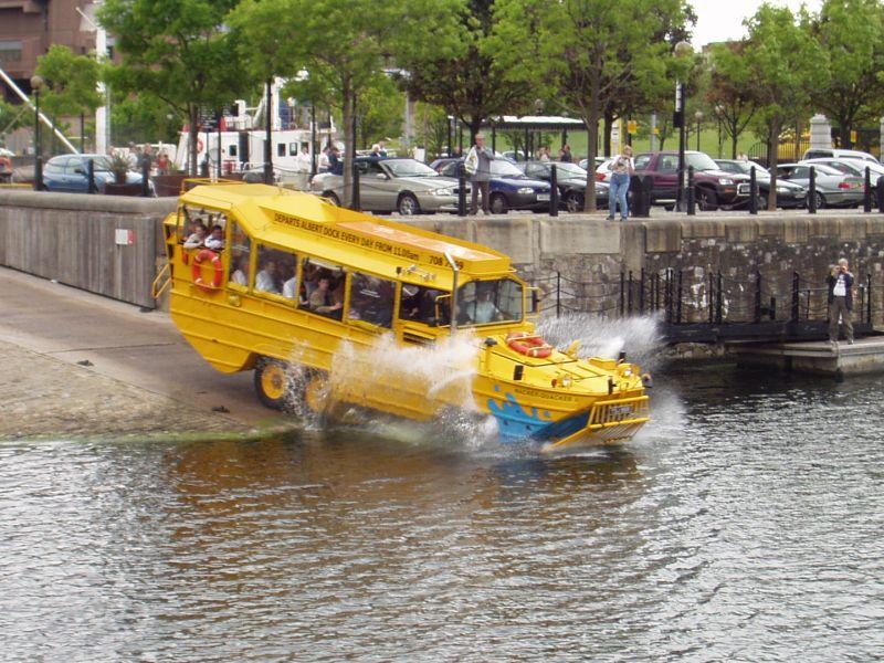 Nee hoor het is een amfibisch voertuig. De wonderlijke combinatie die niet zo goed rijdt als een auto en niet zo goed vaart als een boot.