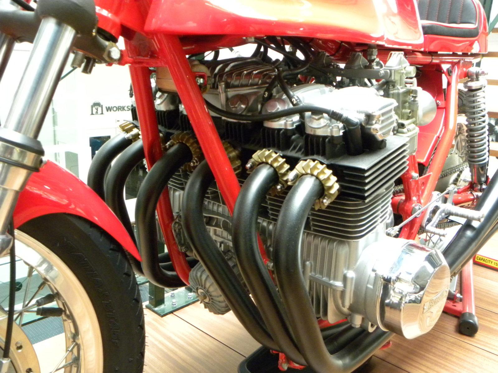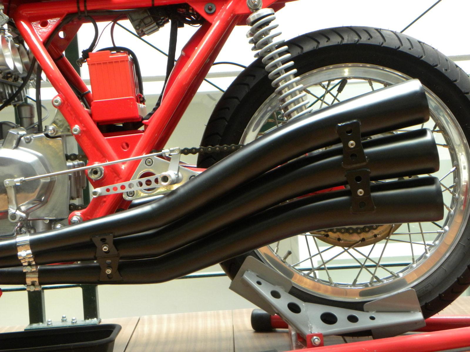 Omdat ze voor demo races werden gemaakt zijn de motorblokken van deze motorfietsen vaak gewoon standaard gelaten. Het racegevoel, en best een paar extra pk, kwamen uit de aanpassingen aan de inlaatkant (sproeier bezetting ivm het rijden met open kelken ) en het wulps pervers gebogen uitlaatsysteem met vier losse megafoons. Zo’n set wulps gebogen megafoons kosten trouwens heel wat per kilo! Ze worden in Italië ambachtelijk gemaakt als ‘confectie maatwerk’. En dat er desondanks nog dapper met deze machines werd gegumd?