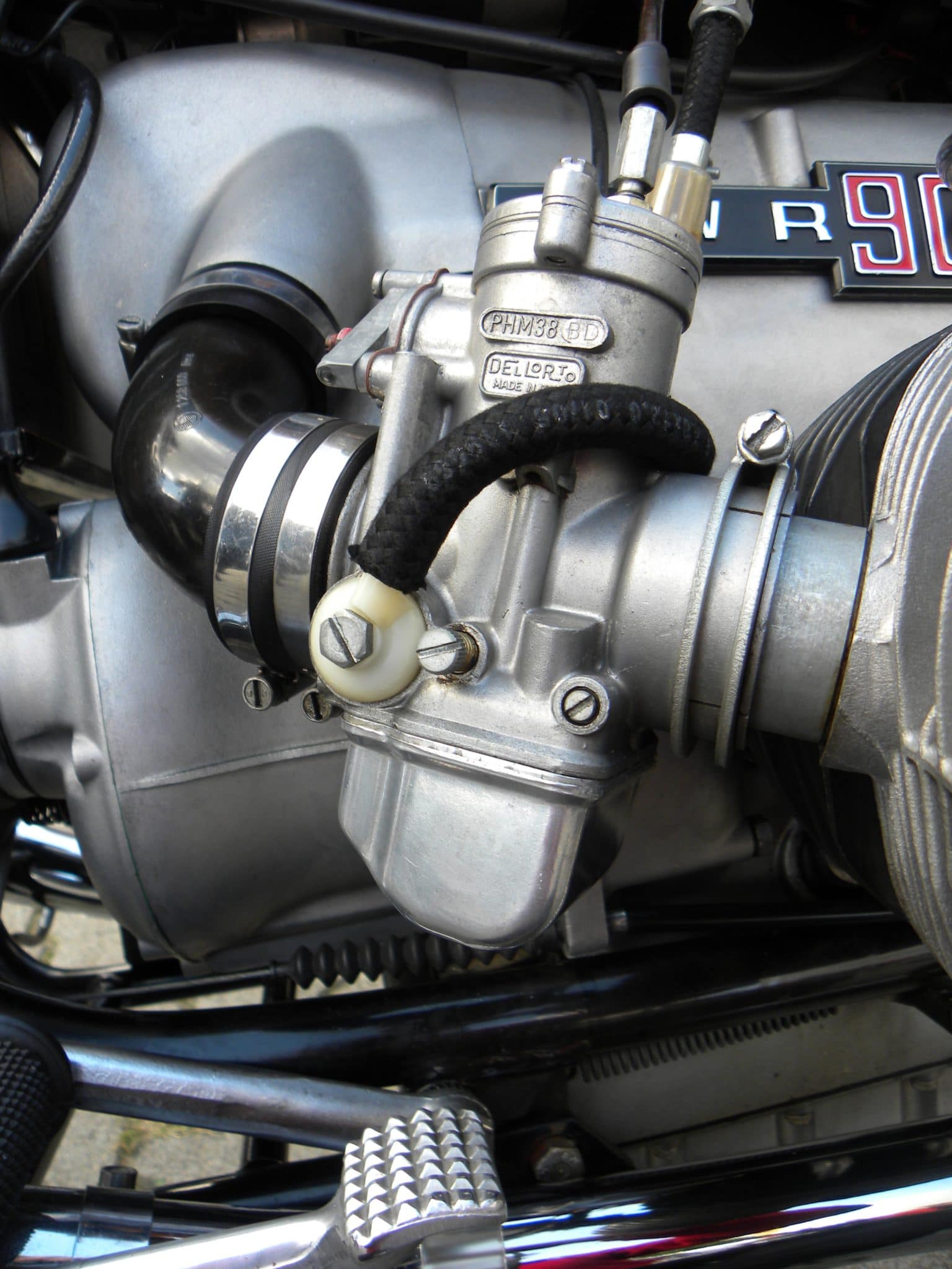 Gelukkig kwam er een duidelijk antwoord op dat stuitende probleem. Met zoveel kenners bij elkaar komt er altijd een antwoord. De Dell‘Orto carburateurs met acceleratiepompen zijn indertijd door BMW als zwaktebod gekozen omdat huisleverancier Bing niets passends voor BMW’s renpaard kon leveren. En bij Italianen kun je nu eenmaal nergens van op aan. De benzineslang aansluitnippels waren er af fabriek blijkbaar in witte kunststof, zwarte kunststof en metaal. De witte exemplaren waren overigens niet UV bestendig.