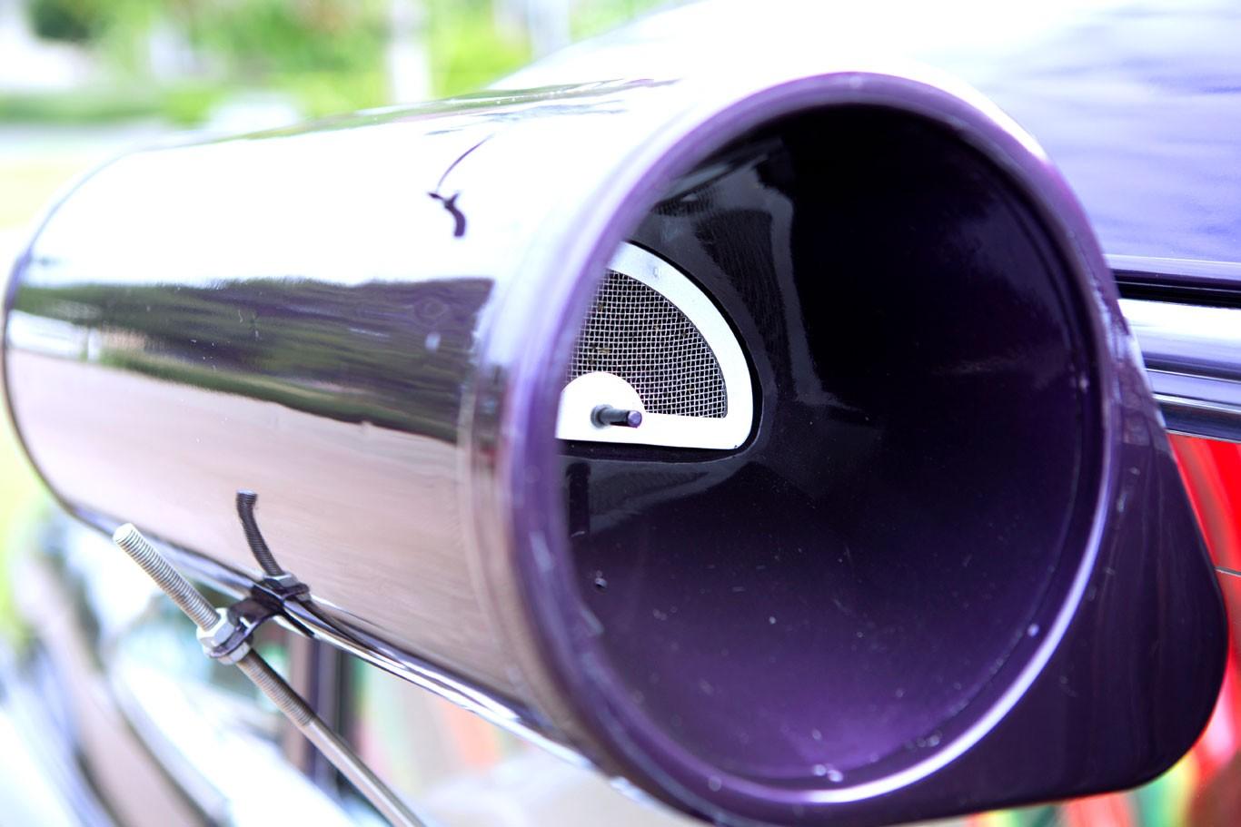 Er zijn nog meer opvallende kenmerken aan de Buick Eight Super. De swamp-cooler aan zijkant van de Buick Eight Super is er zo een. Steevast is de vraag van voorbijgangers waar deze eye-catcher voor dient. Wel, het is een voorloper van de airconditioning. Voordat de rit op een zomerse dag begint, worden ijsblokjes in de buis gestopt. De rijwind zorgt ervoor dat koude lucht via het geopende raam naar binnen wordt geblazen. Doormiddel van een touwtje aan de binnenzijde van de auto, kan een inwendige trommel de ijsklontjes opschudden en het lekwater afgevoerd worden via een overstortje. Dit kan natuurlijk niet handsfree, dus let wel op dat de bijrijder dit werk onderweg doet. Erik heeft deze cooler per stomme toeval op Marktplaats gevonden (werkelijk een gelukstreffer). Bij de vorige eigenaar moest een Kever worden gekoeld. Alleen het zeefje aan de voorzijde ontbrak, samen met de support . Een keukenzeefje is hiervoor door hem opgeofferd, en met een beetje creativiteit kun je een hoop bereiken. Verder was Marktplaats ook de plek waar hij het dienblad vond, waarop tijdens een drive-in movie de consumptie zoals hamburger, ijs en cherry coke kon worden geserveerd. En om in de filmsfeer te blijven. Graag zet Erik voor de fotoshoot de drive-inn speakers naast zijn Buick Eight Super. Zo doende konden we niet alleen de film zien maar ook mee beluisteren destijds.