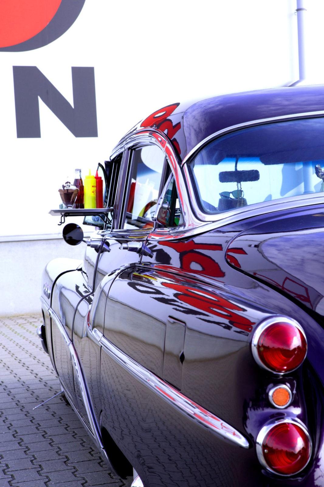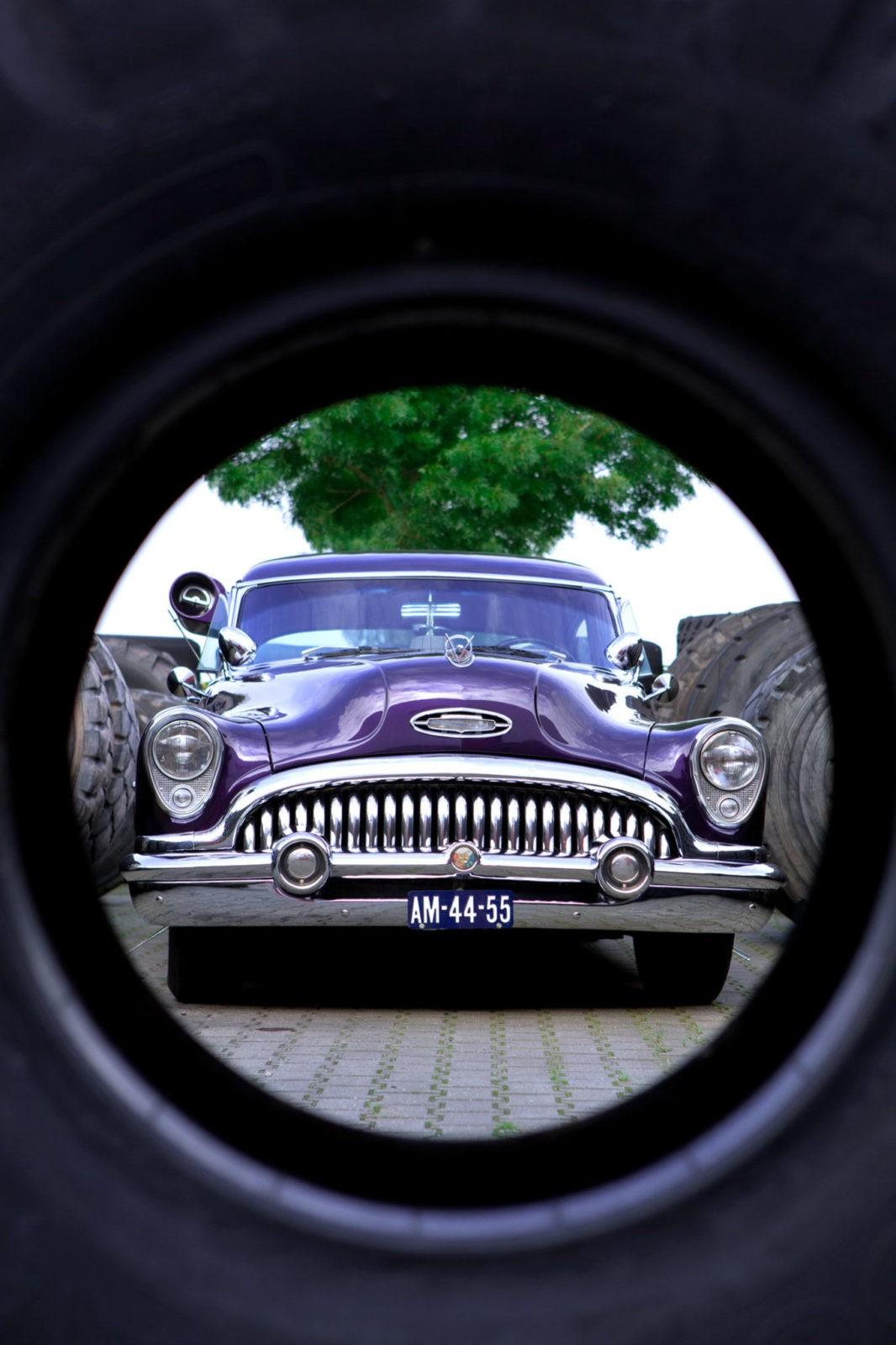 Zo tijdens het project moest Erik toegeven dat de auto helemaal niet in erbarmelijke staat was. De body was op de gemakkelijk te lassen kogelgaten na gewoon keihard. Foto’s tijdens het proces laten zien dat zelfs op de kwetsbare plekken van de carrosserie gewoon staal te zien is. Toch waren er een paar kleine onvolkomenheden. De vloer bij de bijrijder is vervangen en in de kofferbak moest er een nieuw stuk worden ingelast. Na laswerk aan de buitenkant van de body kon er niet aan ontkomen worden om plamuur te gebruiken. Enorm veel tijd is er in het schuren gestopt om de body mooi clean te krijgen. Daarna is een goede epoxyprimer gebruikt als ondergrond voor het spuitwerk. De zijramen heeft hij na laten maken bij Carglass. Daar het om vlakke ramen gaat en kan er perfect zelf een mal worden gemaakt. De bolle voorruit heeft hij nieuw gevonden en aangeschaft in de USA. De hemel en verdere stoffering was ook aan vervanging toe “Voor zover het überhaupt al aanwezig was. Enkel en alleen waren de banken overtrokken met hoezen. Vloer- en hemelbekleding zat er niet meer in”, vertelt hij. Deze werkzaamheden zijn vakwerk en heeft hij dus uit handen gegeven. Uiteraard zou uiteindelijk ook het spuitwerk worden uitbesteed, in een kleur die hij zelf erg mooi vindt. Het oogt paars in de zon, maar is zeker geen originele kleur van Buick Eight Super in die jaren. Het vaak geziene zwart – de originele kleur van deze auto – vindt Erik echter te somber. “Maar bij mijn keuze was een ding was zeker dat de kleur wel donker zou gaan worden. Zo komt het chroom mooi naar voren. Ook het afhangen is vakwerk. Zeker bij auto’s uit de jaren vijftig. Dus dat heb ik ook uitbesteed,” weet Erik. Toch kun je zien dat zelfs een vakman niet altijd in staat is om volledig rechte lijnen te behouden tussen de deuren en de spatborden. De linker- en rechterkant van de Buick Eight Super verschillen, al valt dat niet echt op.