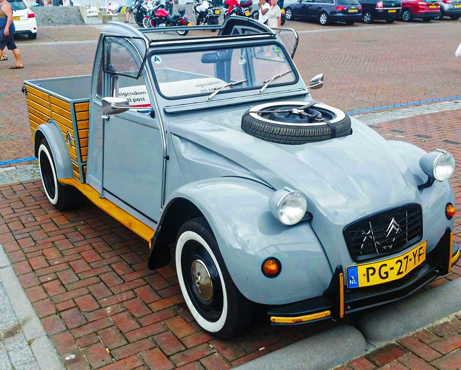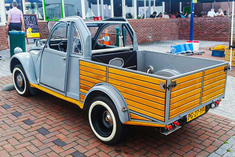 De Citroën wijkt heel veel af van de reguliere 2 CV. De combinatie met de fraaie houten laadbak maakt de aangepaste carrosserie heel aantrekkelijk. Een nieuwe benadering van een bedrijfswagen? Op het typeplaatje staat ‘Ramasser’, dus het oprapen van spullen zou toepasselijk zijn. Let u eens op de bijzondere alternatieve plaats voor het reservewiel, verzonken in de motorkap. Dit idee is overgenomen van de Citroën in de Sahara 4×4 uitvoering met twee motoren, ook al weer een unieke Citroën uitvoering.