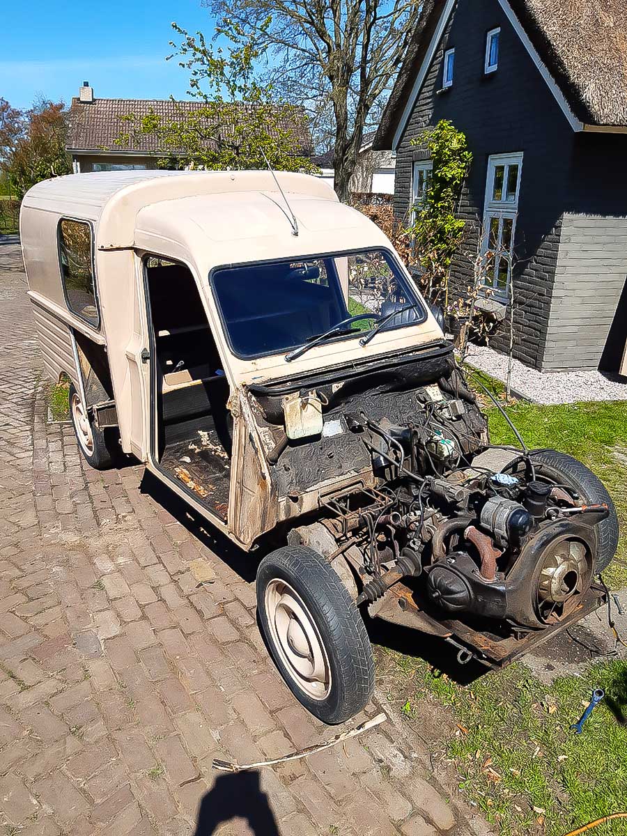 Dit verhaal gaat over de Acadiane die nu ‘in behandeling’ is, want daarover raakt Meindert niet uitgesproken. De bestelversie van de originele Citroën 2 CV kwam in de jaren 50 op de markt en werd in de jaren 70 vervangen door de Acadiane. Vergeleken met de 2 CV was de Acadiane eigenlijk een luxe model en werd net als de 2 CV vaak ingezet door de middenstand. Het was natuurlijk wel onmiskenbaar familie van de 2 CV. De foto’s laten zien dat het chassis en de motor inmiddels onderhanden zijn genomen. De carrosserie was nog in een redelijke staat en behoefde minder aandacht.