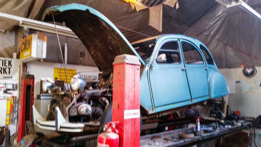 ’t Is alsof de tijd hier heeft stilgestaan. Vele, heel veel 2CV’s die staan te wachten op restauratie? Of misschien als onderdelenleverancier? Of wordt het echt het eindstation van de vele Franse ‘voitures’?