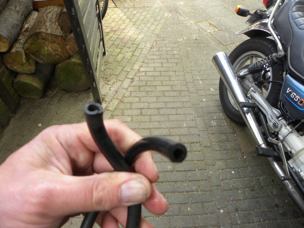 Die laatste gemiste halve millimeter viel me pas op toen de benzine gestaag op de grond begon te druppelen. Gelukkig paste een ouderwets stukje blauw transparante, plastic Ø5 mm slang na opwarming met de verfbrander over de Ø6 mm aansluiting. de vernuftige kruisconstructie liet ik maar weg. Daar raakte de benzine volgens mij toch alleen maar van in de war. Nu eens kijken of er onder last voldoende benzine in de carburateurs komt. Gelukkig heb ik wel de metalen aansluitstukjes op de Dell’Orto’s. Ze waren er ook van wit en zwart plastic. De witte konden niet tegen UV. Ze braken spontaan af. De konden zwarte niet tegen benzine geloof ik.