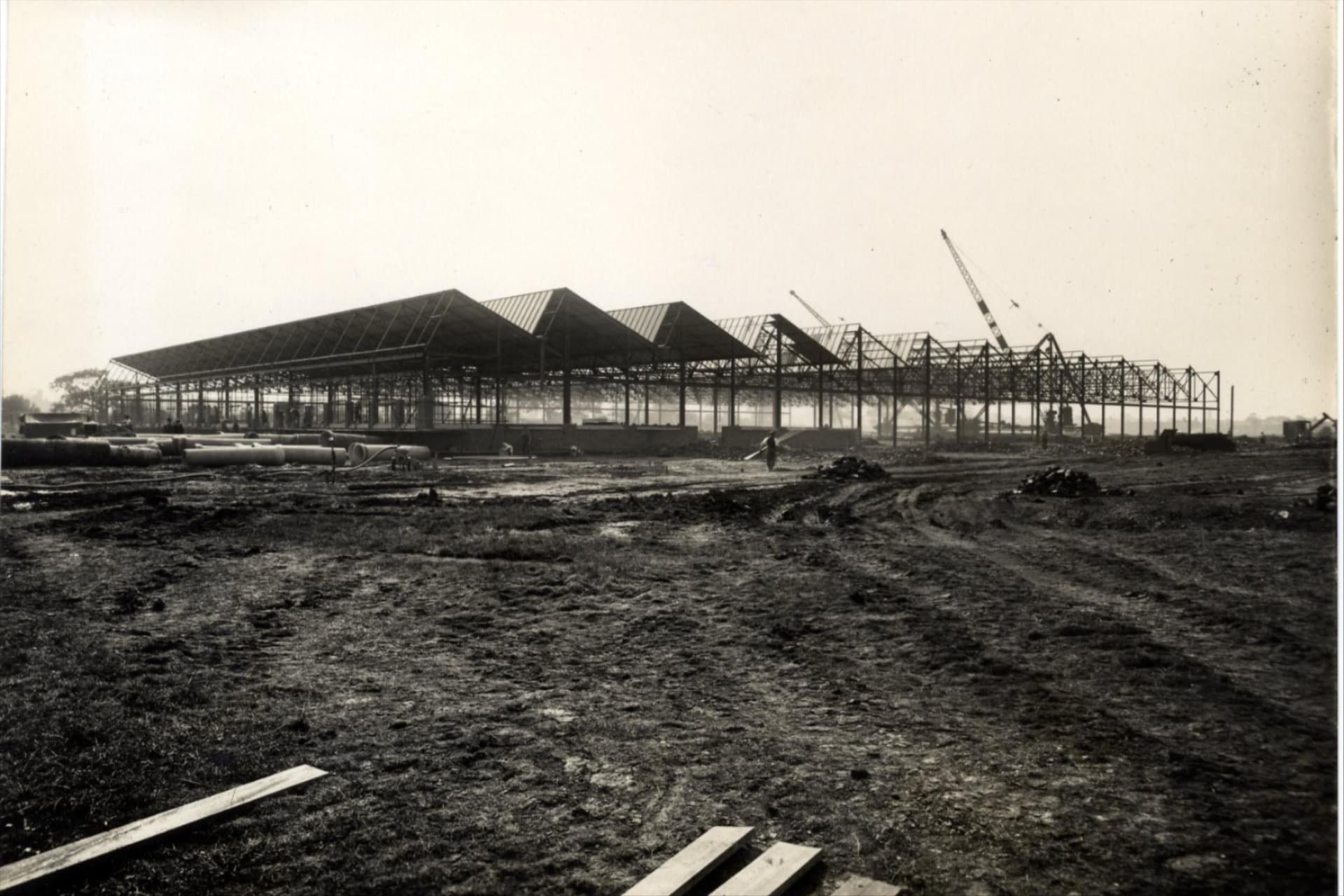 een nog tamelijk jonge Pyms Lane fabriek, die in 1938 verrezen (enkelvoud)
