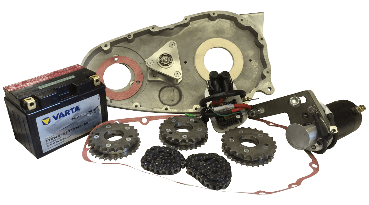 En voor de echte harde kern is er natuurlijk een oplossing bedacht in Engeland. Voor de meeste Britse eencilinders zijn er sets te koop waarmee de motorfiets, na meer of minder operatief ingrijpen, te transformeren is tot een elektrisch startend exemplaar.