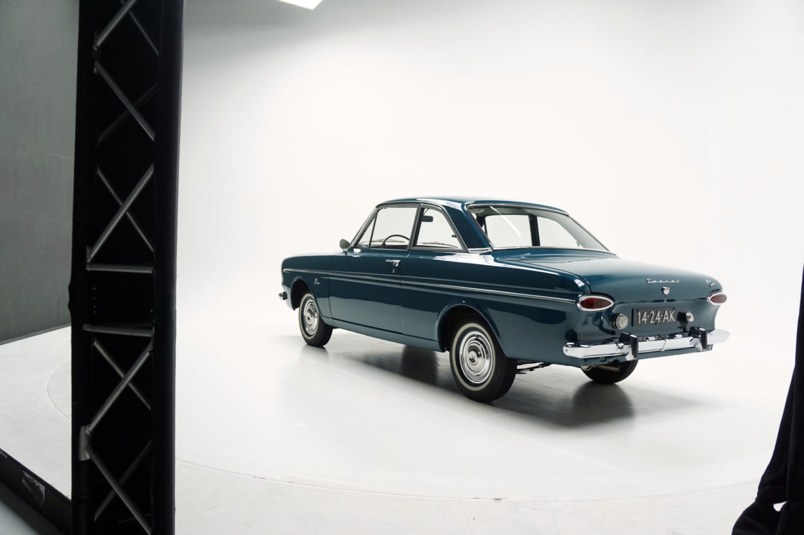Als de groene Ford in de studio op de juiste plek gemanoeuvreerd is, veegt Roger liefdevol nog wat vette vingers weg. De sessie kan beginnen. De Ford staat op een langzaam ronddraaiend podium onder een boog met tientallen fotocamera’s. Simultaan klikken om de paar seconden 25 camera’s. Even luisteren of je ze kunt horen… en ja hoor. Zo worden 2400 beelden gemaakt. Het duurt eventjes, zo’n 8 minuten, voor die allemaal in de computer geladen zijn. En de pc staat daarna nog een paar uur te draaien op het samenvoegen van al die beelden tot het eindproduct: een beweegbare 3D-foto. Daarop is de originele Taunus van alle kanten, ook van boven, te bekijken. Roger kiest de 3D-foto voor op zijn vaste computer en als app-je voor op zijn iPad: leuk om mee te showen.