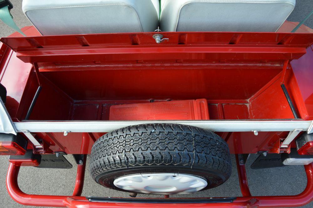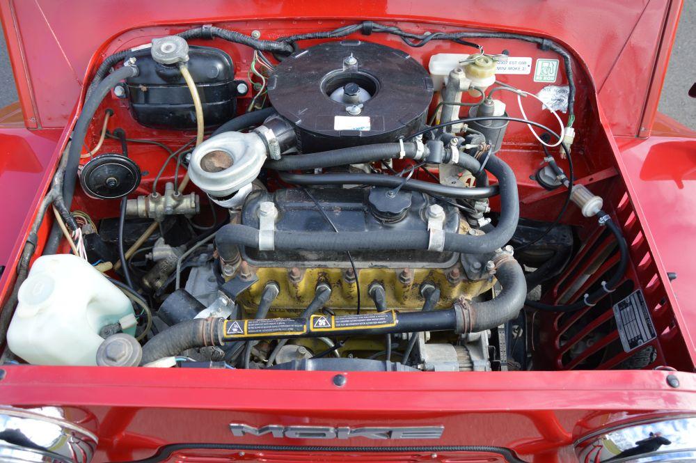 Deze Mini Moke vonden we bij Classic Park en het is een laat exemplaar uit 1993, gebouwd in Portugal door het Italiaanse Caviga dat in 1990 de productierechten van MG Rover had gekocht. Caviga bouwde slechts 1.500 exemplaren. De Portugese Moke’s hadden aan de achterzijde een afsluitbare bak (de omschrijving “kofferruimte” is in dit geval overdreven). Deze latere modellen hebben ook een beduidend steviger rol kooi dan vroegere exemplaren. Deze mooi onderhouden Mini Moke heeft maar 13.800 km gereden.
