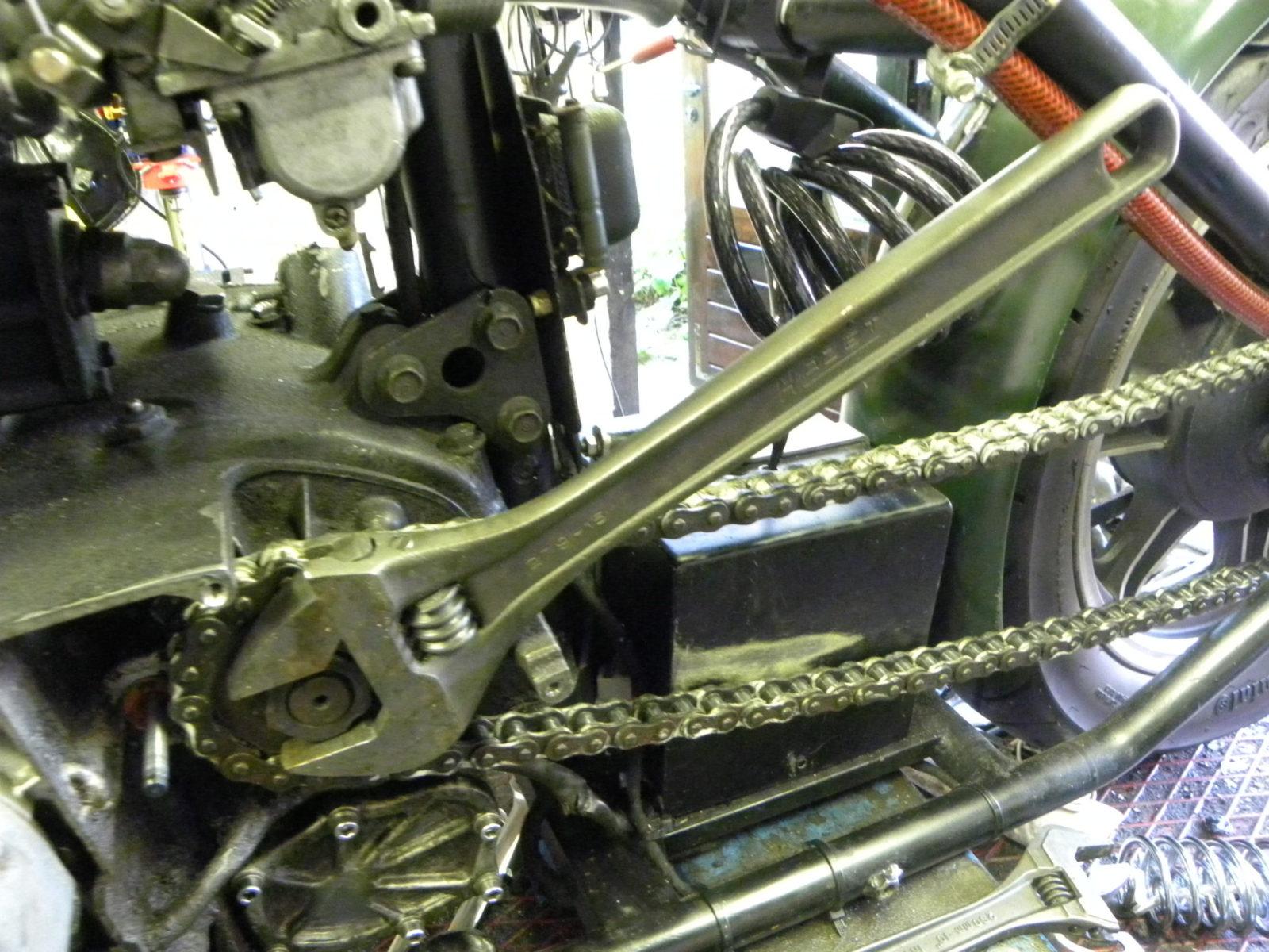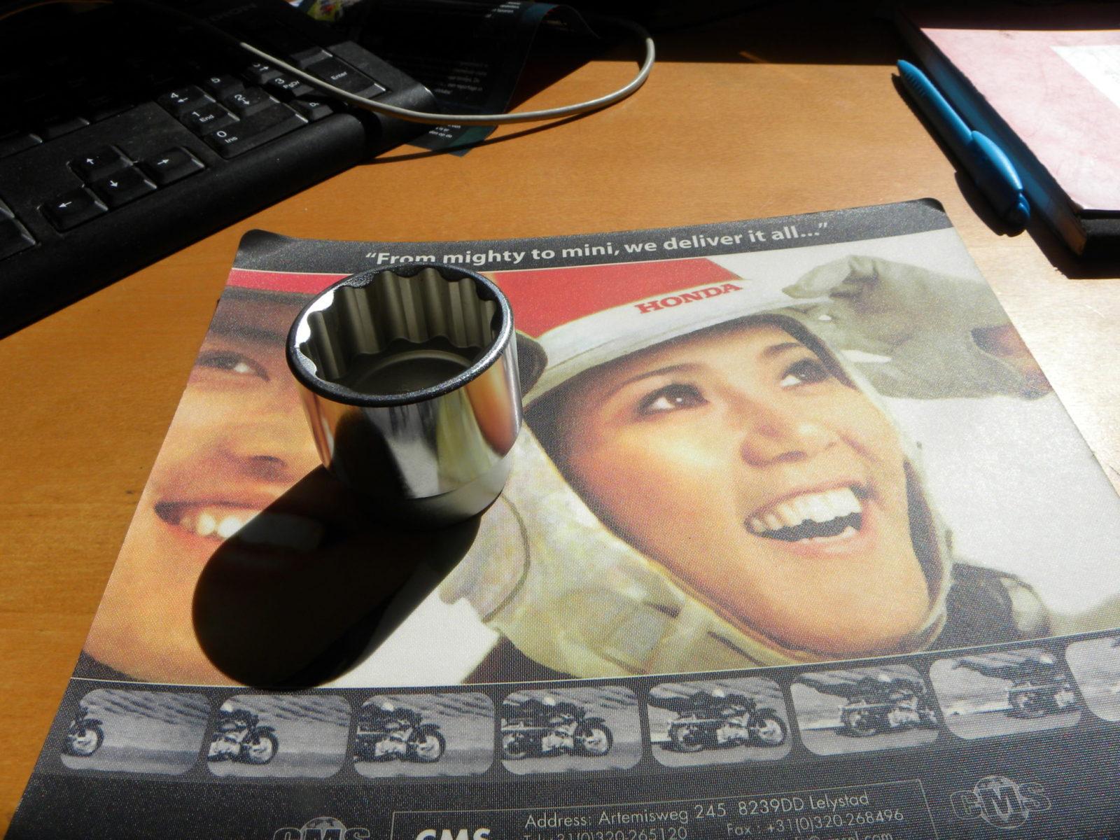 De betreffende as vervangen lijkt een gevalletje uithalen en doorsteken. En omdat te doen hoeft alleen even de koppeling er afgehaald te worden. Wat direct opviel was dat de koppelingskorf een lip miste. Daarvan was al rijdend niks gemerkt, maar toch… De deksel werd gedemonteerd. De platen uitgenomen en keurig opzij gelegd. Dan moet de centrale moer los om de koppelingsnaaf te kunnen verwijderen. Daarom moet de koppelingsnaaf geblokkeerd worden. Anders kun je draaien tot je een ons weegt. Op de manier die bij Europese, Amerikaanse en Russische motoren al 100 jaar goed gaat werd de koppelingsnaaf geblokkeerd. Dopsleutel met de lange arm er op. Kracht zetten. “PING!” Ah, was dat zo gekomen. De tweede lip van de koppelingskorf lag er nu ook af.