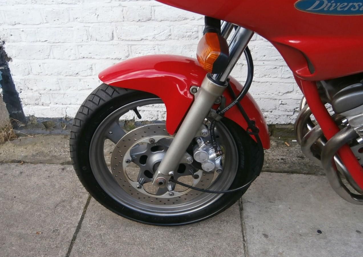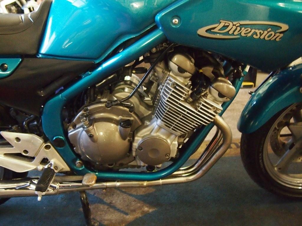 In de tussentijd is er wel een gevaar voor Moto Guzzirijdrs die er zo’n dappere kleine viercilinder bij kopen als brommer. Die Guzzi California rijders hebben de neiging hun lange zijstandaard kewl uit te schoppen en de motor dan op het ‘klonk’ geluid van de aanslag van de jiffy los te laten. Een Guzzi staat dan. Een Yamaha Diversion niet. Het uitklappen van de jiffy gaat net zo als bij de Guzzi. Maar de ‘klonk’ bij de Yamaha is als de zijstandaard automatisch terug slaat naar zijn ingeklapte positie. Dan laat je de motor los. En dan dondert hij om. Boven op je. Dat is lachen voor het publiek “Mamma, wat doet die meneer?” Dat soort dingen wil je niet horen.