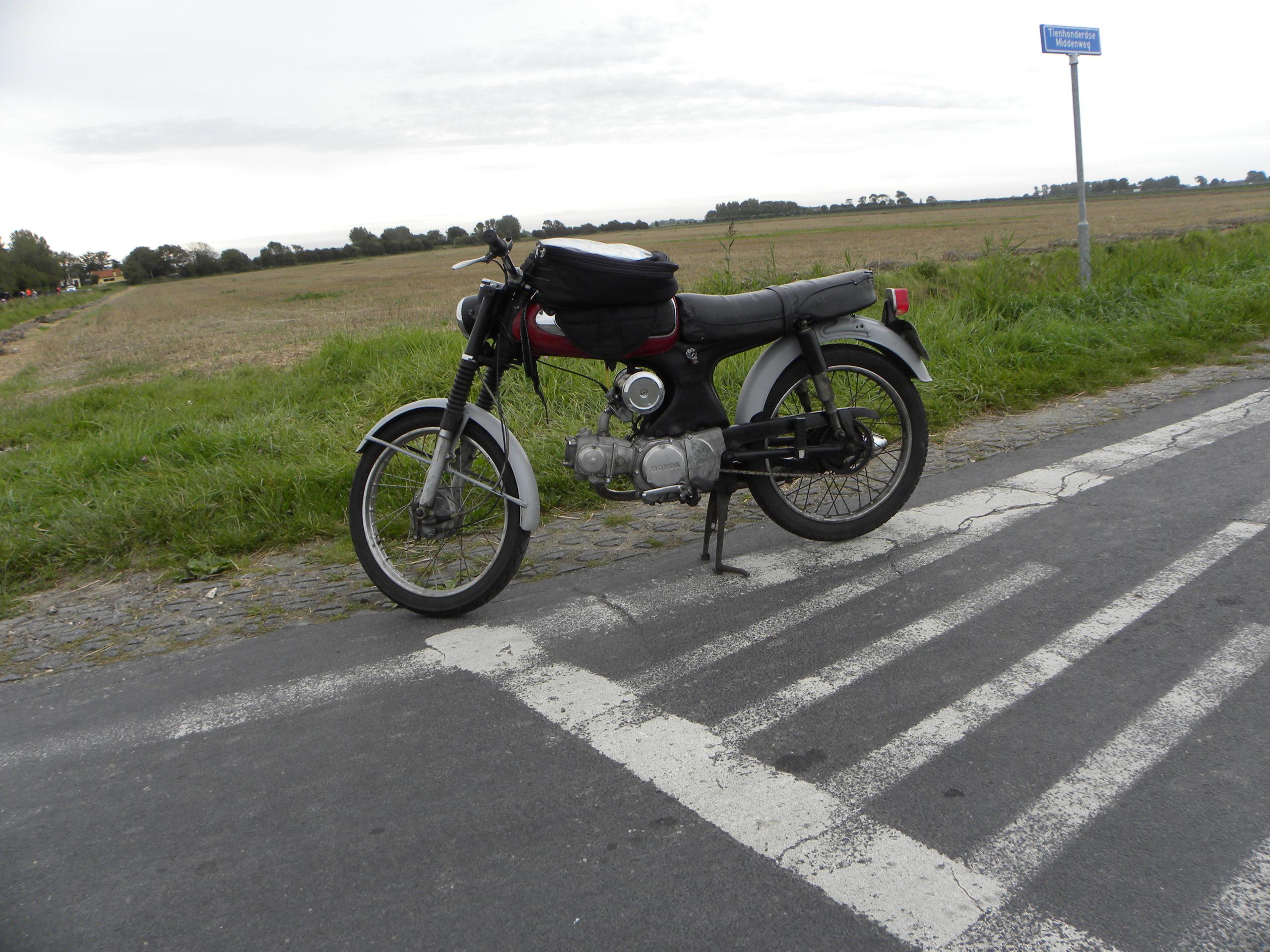 We besloten iemands eigen ‘Route 66’ eens rustigjes over te doen. Ooit was mijn vriend Ernie in zijn prille jeugd van Tiel naar Cadzand Bad gereisd. Op de fiets. De foeragering tijdens die nonstop monstertocht bestond uit fietstassen vol met literflessen Chocomel. Die rit zouden we zo’n halve eeuw later nog eens rijden. Op twee Hondaatjes. Ernie’s 90 cc supersport is al zo’n veertig jaar bij hem. De reis begon met een vers gereviseerd 90 cc blok. De Supercub was een opgevoerde Japans-Chinese bastaard met een enorme carburateur en een brul uit de uitlaat waar elke Ducati of Laverda eigenaar jaloers van werd.