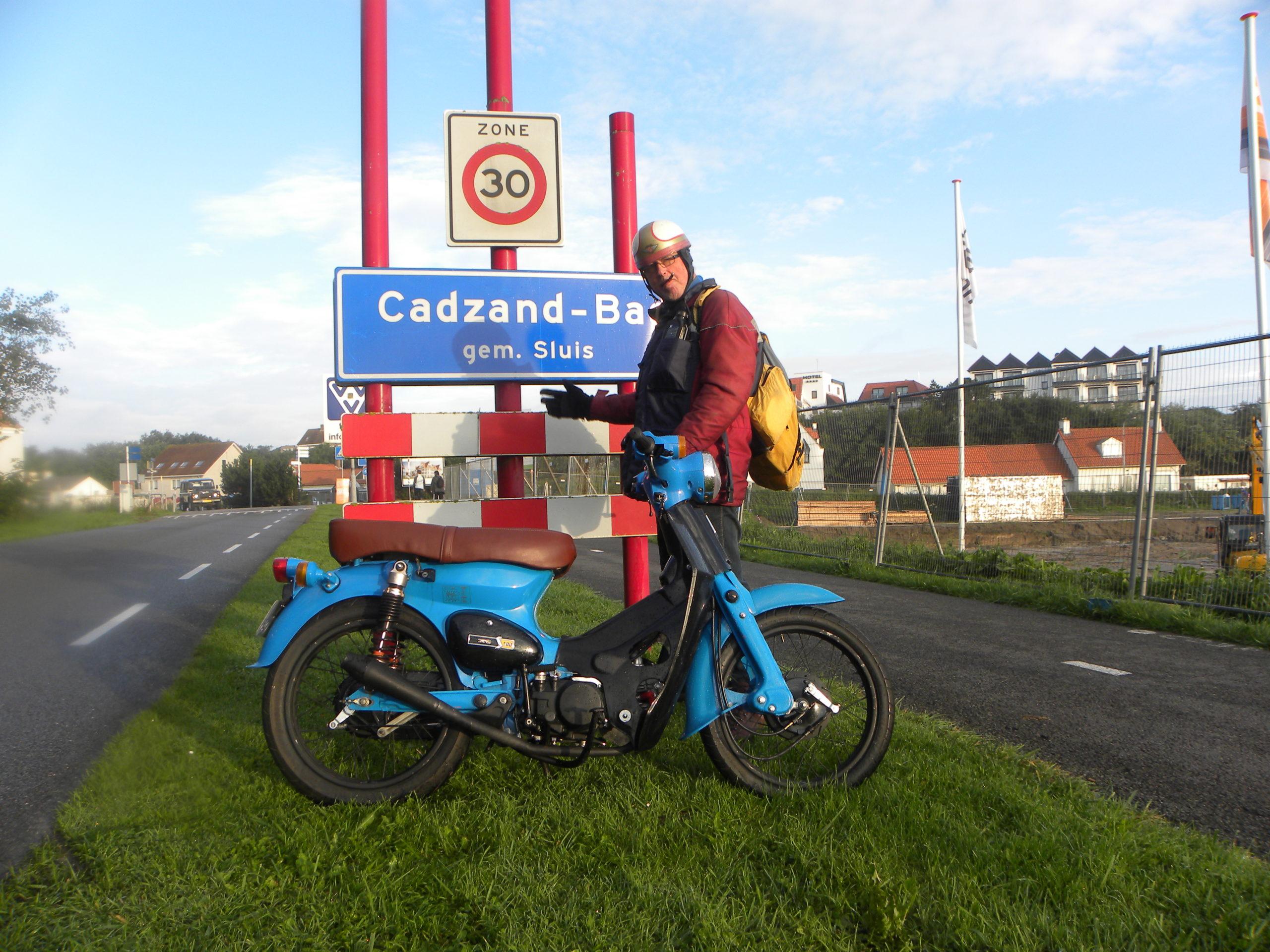 De uit het geheugen gereden koersroute was in vijftig jaar nog te rijden. Al moesten we nu door de bebouwings- en expansiedrift van een halve eeuw opeens door woonwijken, winkelcentra en voetgangersgebieden. En iedereen knikte ons vriendelijk toe. Er werd gezwaaid. Er werden duimen opgestoken. Het veer Kruiningen-Perkpolder is allang uit de vaart. Dus wij pakten de boot naar Breskens. Die ferry is er voor voetgangers, fietsers, brommers en scooterrijders. Wij reden op twee officieel gekentekende motorfietsen. Gelukkig hadden we ons huiswerk gedaan.