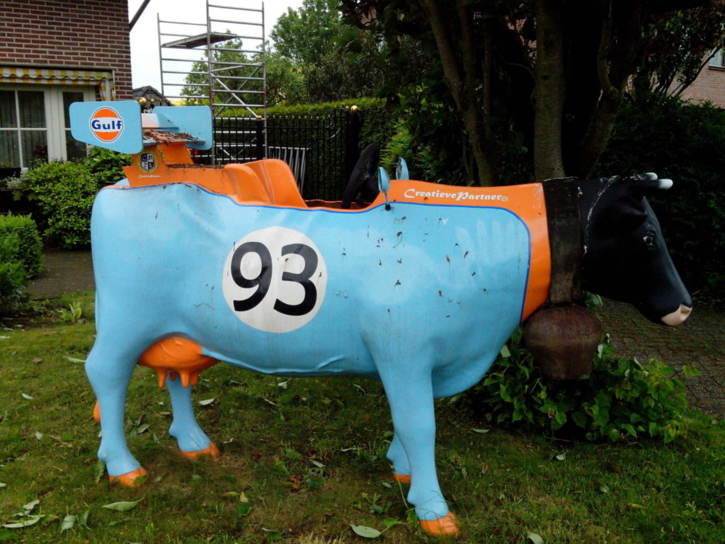 We rijden er regelmatig langs. En het intrigeerde ons steeds meer. In Rheden staat er een koe in de voortuin. Een koe in Gulf Racing colors. Met achteruitkijkspiegels.