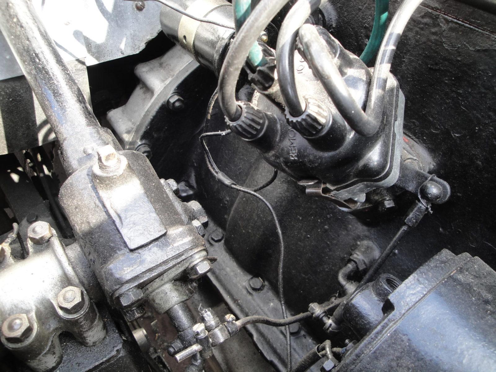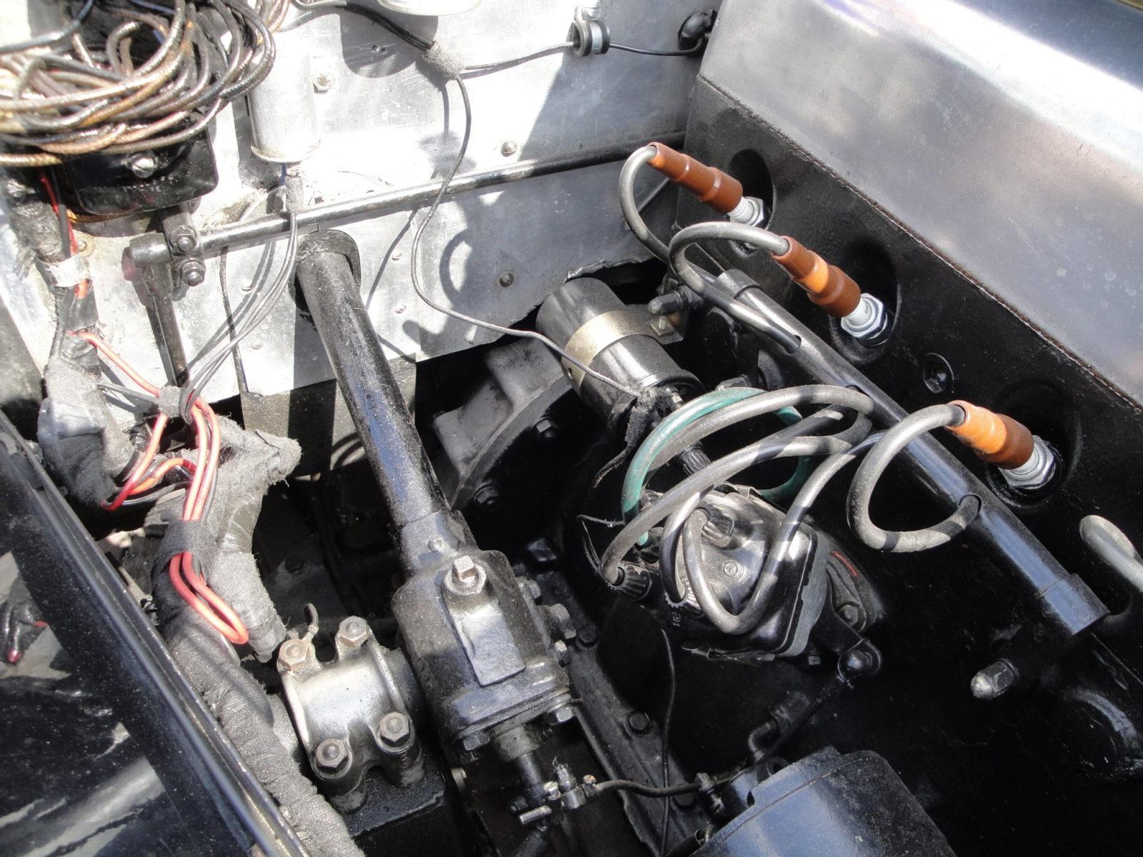 De bedrading is verregaand origineel, dus voorzien van geweven kous. Het zwart van het blok is niet tegen offer gevallen aan cosmetische terreur. Zwart zoals zwart bedoeld is. Onder een motorkap en op gietijzer in elk geval. De bougiekabels zijn onderworpen aan een milde vorm van bondage. Dat houdt ze keurig in het gareel. Her en der zien we een optisch wat moeizaam in het geheel ingeburgerd AMP stekertje, zoals aan de gelijkstroomdynamo van Lucas uit de tijd dat er nog geen grapjes over dat merk werden gemaakt. De horizontale SU carburateur zit op zijn gemak gehurkt aan de zijkant van de cilinderkop. Verschillende bewegende verbindingen zoals de verstelling van de ontstekingvervroeging zijn keurig met draad geborgd. Een poos geleden al, zo te zien. Mooi.