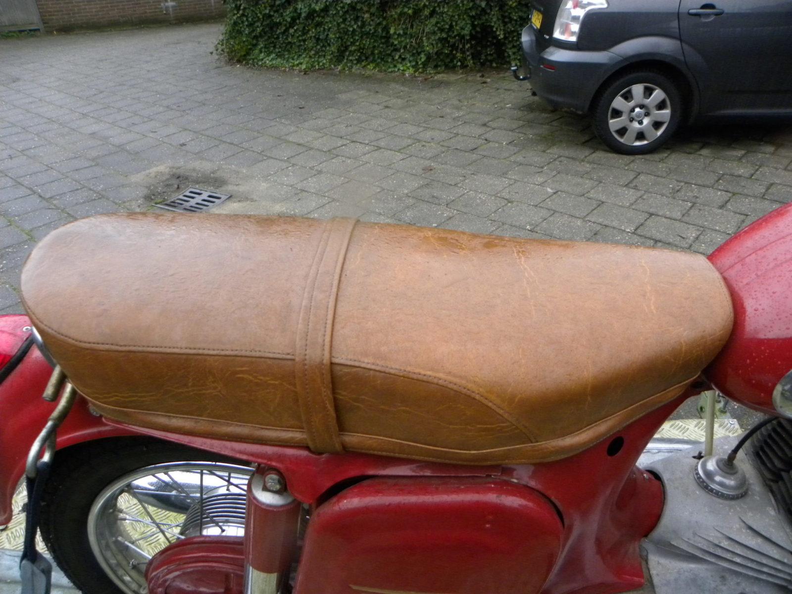In het huidige tijdsbeeld is zo’n serieuze 350 iets vertederend met het formaat van een flinke brommer. . Het starten van een 350 cc tweetakt is geen heksenwerk, en na even gevlotterd te hebben draait de twin direct mooi neuzelend rond. Verwacht bij een draai aan het gas geen wonderen. De kickstarter wordt weer terug geklapt in de schakelpositie. De koppeling gaat vingertjelicht, de schakelwegen zijn lang, maar duidelijk. In het verkeer is zo’n Jawa nog zeker geen sta in de weg. De machine doet het prima in de stad door zijn soepele motorkarakter en is prettig gezelschap op de secundaire wegen. Het enige ‘dingetje’ van deze motorfietsen is de ontstekingsinstallatie. Maar daar zij tegenwoordige goede-, en betaalbare alternatieven voor. De Jawa op de foto’s ie er eentje die geadopteerd werd nadat hij minstens tien jaar droog en geschorst had staan slapen. Hij moet een heel goed leven hebben gehad, want hij had in een showroom vooraan op de tweede rij kunnen staan.