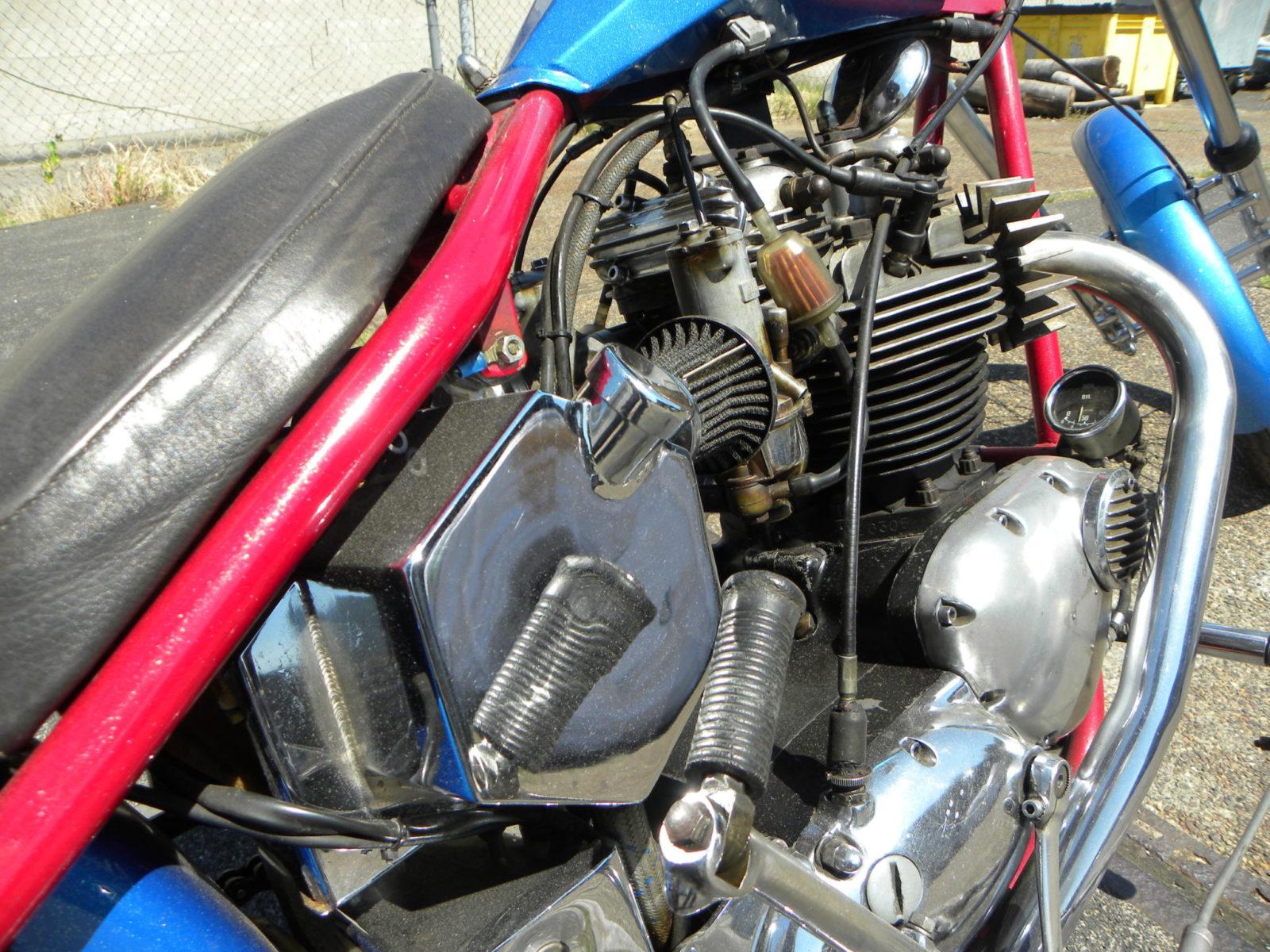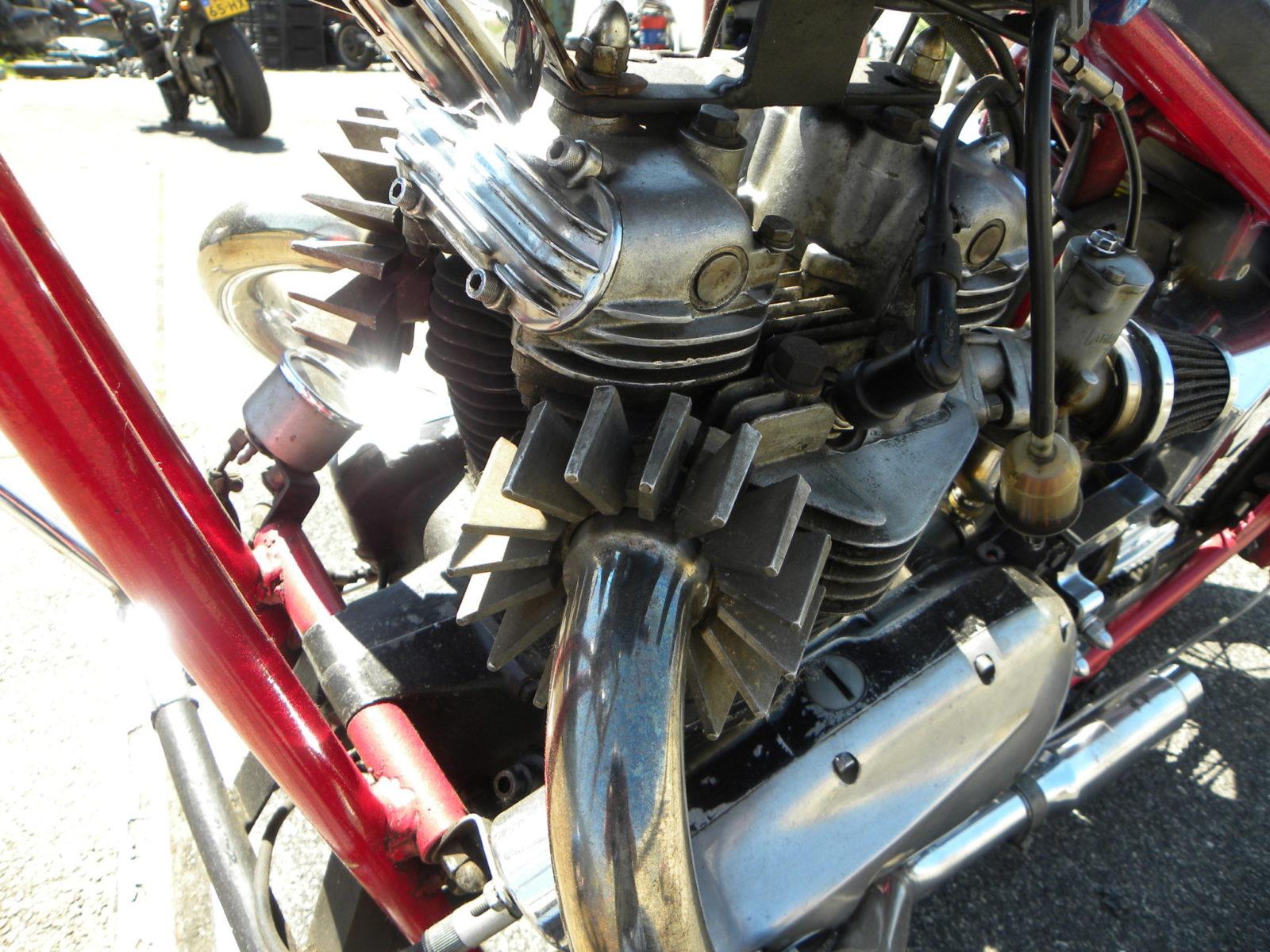 Een geveerd achterframe! Dat is voor watjes! Maar het scheelt een beetje. En alle beetjes helpen. Maar voor de rest is deze chopper, op Nederlands kenteken, een heel zuiver voorbeeld van zijn soort. Volgens zeggen heeft het ding nog maar bar weinig gelopen. Het blok zou zelfs nog kakelvers zijn. Intussen is zijn stijl zo gedateerd dat het een echte klassieker is. De Triumph is intussen verkocht. En naar alle waarschijnlijkheid komt hij in een collectie te staan. Dat lijkt niet fout. Want onder ons gezegd en gezwegen: Staan doet zo’n machine immers beter dan rijden.