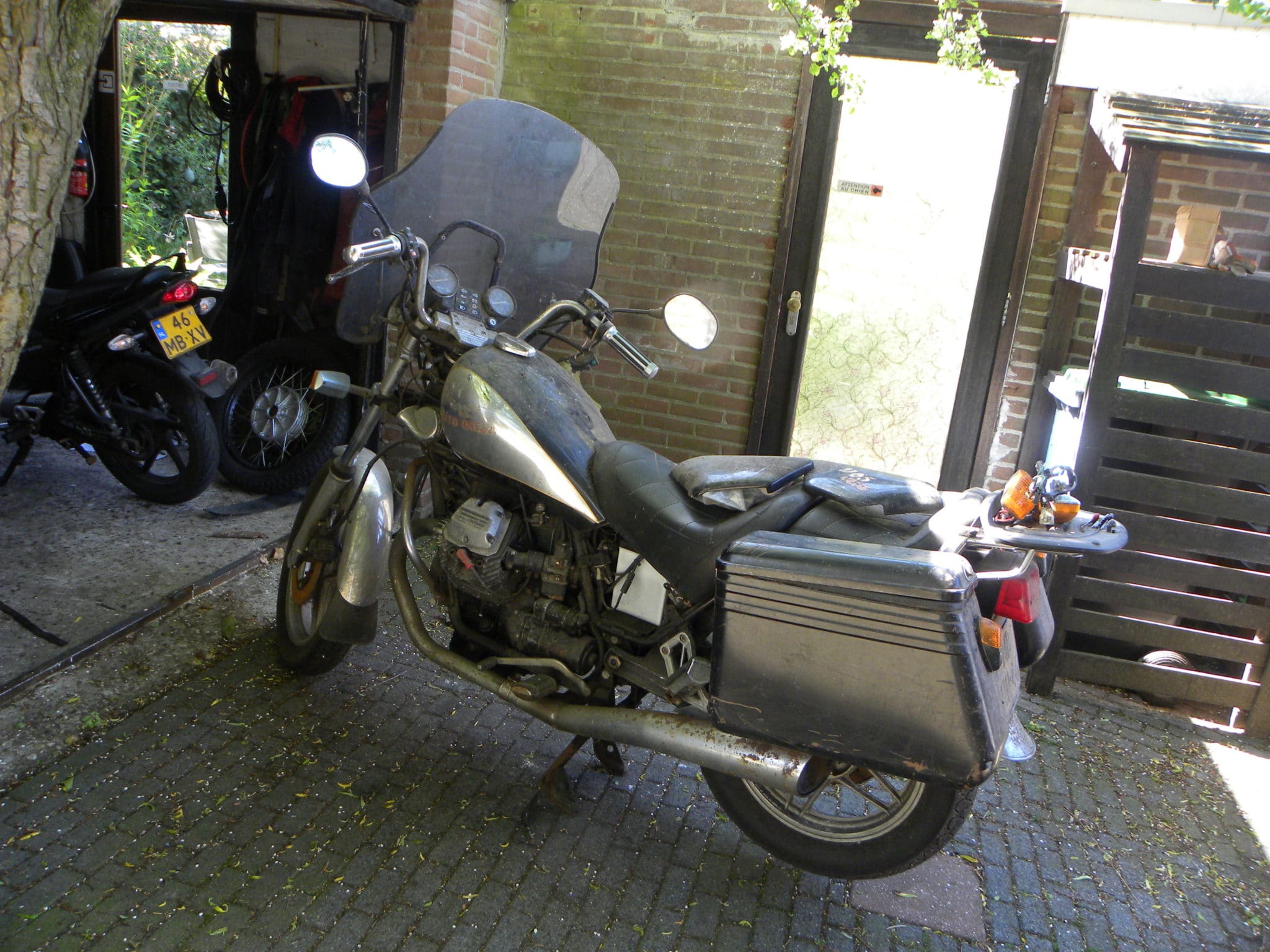 In het zuiden van ons land sprak ik met een weduwe over de nalatenschap van haar overleden man. Ik keek daar naar meer dan honderd gerestaureerde klassiekers en een paar wagonladingen onderdelen plus een stuk of 8 auto’s. In Noord-Frankrijk zag ik in een loods de Amphicar met Nederlands kenteken die het Kanaal was overgestoken. Ik zag in iemands schuur zes MV vierpitters en acht Bimota’s staan. Een Peppie en Kokkie VW die klaar voor de pers stond bleek een Kübelwagen te zijn waar alleen de motor en chassisnummers 25D $ waard bleken. Zo zijn er meer van die dingen geweest. Maar dit was de eerste keer dat ik zo’n authentieke schone slaapster/slaper zelf mocht adopteren. Geheel indachtig onze nieuwe nationale neolibeale insteek was ik nu aan de beurt: ‘Eiges komt eerst!‘ Eindelijk! De Guzzi werd me gegund. Dus de tegenprestatie voor de adoptie was symbolisch.