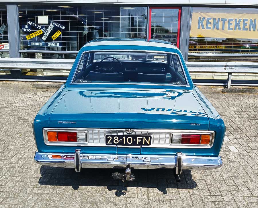 We vinden onderweg een bonte mengeling van klassiekers. Soms helemaal origineel, en soms ook weer niet. Soms zie je dat de auto heeft geleefd, maar ook in de nieuwstaat van zoals deze Ford 20 M. Een ruime en geruisloze wagen, waar je gemakkelijk in- en uitstapt, maar ook waar je achterin net zo comfortabel zit als voorin. Met een kolossale koffieruimte voor alle bagage. Met recht een auto voor het hele gezin.