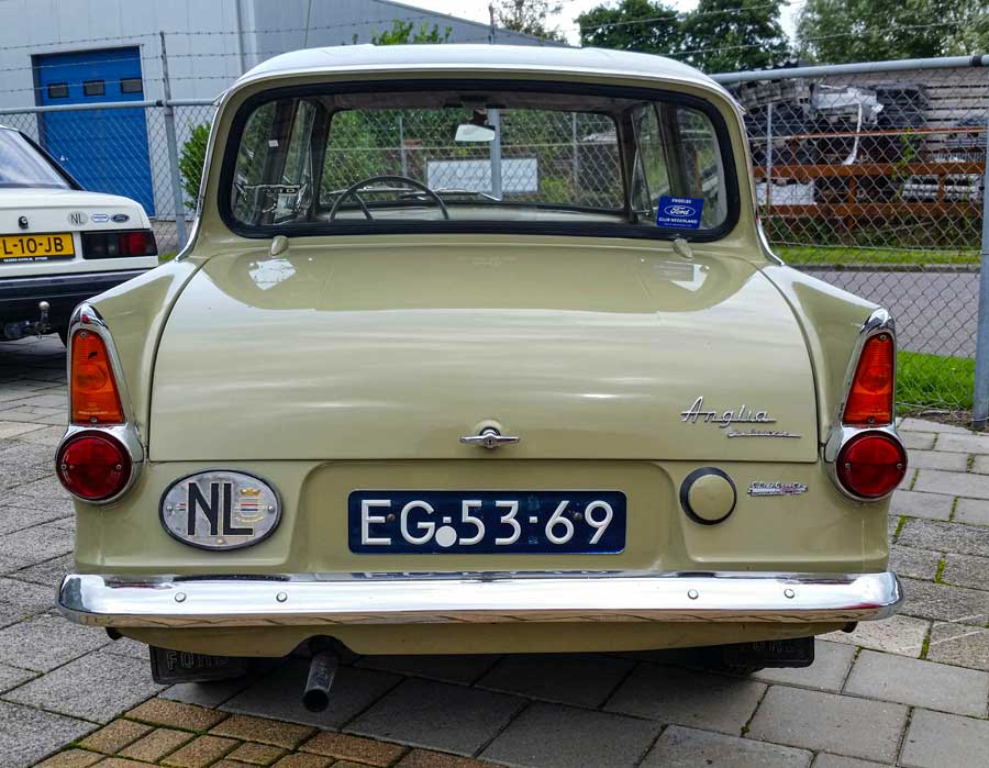 De sticker achterop deze fraaie beige Ford Anglia de luxe verraadt dat de eigenaar lid is geweest van de Engelse Ford Club Nederland. Eigenaren van alle Fords die in Engeland zijn geproduceerd konden lid worden. Deze echte stijlvolle originele Nederlands gekentekende auto hoorde helemaal in de club van liefhebbers.