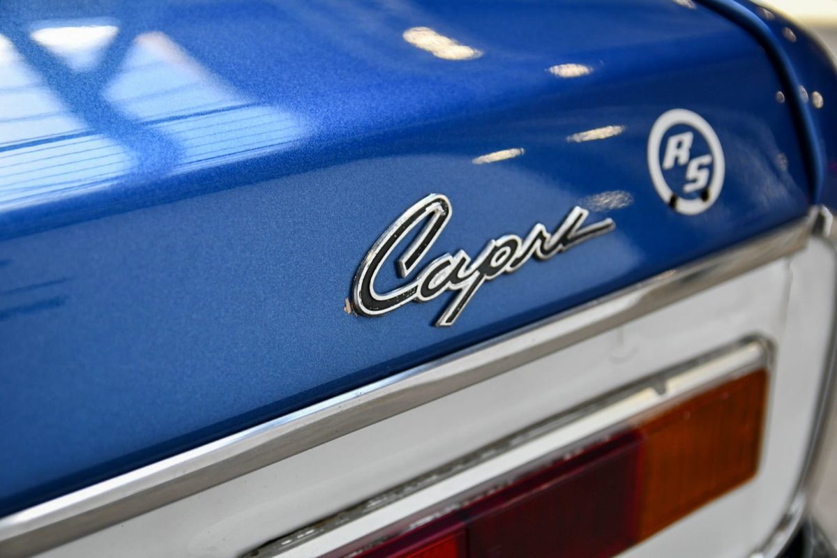 Deze Ford Capri 2600 RS is nooit gerestaureerd, het is een fraai en vergaand origineel exemplaar. Hoe langer je de auto bekijkt, hoe meer opvallende details er in het oog springen. Kijk bijvoorbeeld eens naar het verloop van de witte motorkap kleur, die zich subtiel over de flanken doorzet, en de blauwe bubbel op de kap, die zich in andere carrosseriedelen doorzet. Of de gedeelde bumper aan de achterzijde, het witte achterpaneel en de centraal geplaatste uitlaat. Mooi!
