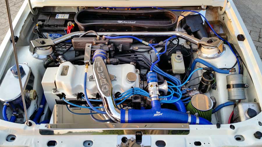 De carrosserie was optimaal, net als het interieur. Maar de techniek was lang niet 100 procent. De motor liep onrustig. De eerste jaren na aankoop waren er momenten van spijt. Logisch dat hij vaak dacht ”Waar ben ik aan begonnen?” En toch maar weer een investering van energie, euro’s en geduld. Een nieuwe koppelingset, demontage van de motor, andere radiateur voor extra koeling (dubbele koelvinnen). De kop gereviseerd, bleek gescheurd en dus opnieuw gevlakt, 4 nieuwe zuigers, kortom een financieel tranendal. In 2016 kwamen het optimisme en de wilskracht terug. De klus moest worden geklaard om van de Ford Escort RS 1600 Turbo te kunnen genieten.