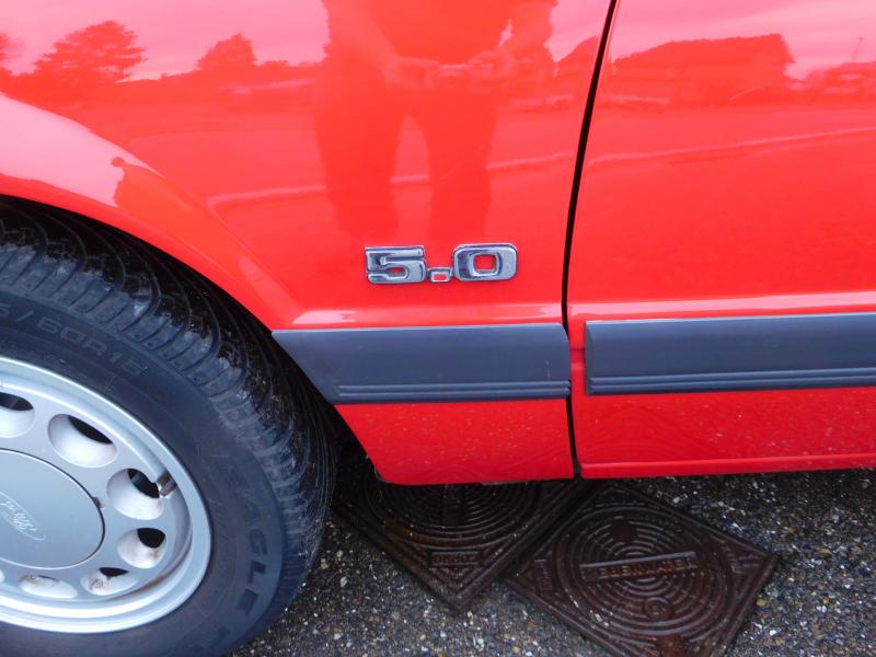 Al met al is de 1986’er uit Heusden-Zolder natuurlijk niet zo iconisch als een vroege Mustang. Maar deze rode Mustang van de derde generatie (een van de 1119 in Canyon Red uitgevoerde exemplaren) heeft feitelijk erg mooie lijnen. Hij is zelfs elegant te noemen. Het ‘Echt Bruut Amerikaanse’ spat er eigenlijk alleen van af door de matzwarte streep op de motorkap. De gothic zwarte mascara om de lampen is ook stoer. En dan is er natuurlijk die V8 voor de handgeschakelde vijfbak. En zo kom je door een typevoud toch bij een heel mooie Mustang.