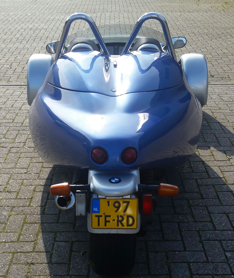 Is het een motorfiets? Is het een auto? Opvallend is dat deze driewieler twee wielen voor heeft en eentje achter. Door het lichte gewicht is het een heel snel voertuig. De RDW noemt het een motorvoertuig waarbij geen helm is verplicht, maar de APK boven de 400 kg wel. Voor de veiligheid zijn gordels wel een noodzaak en ook een verplichting. Zegt de naam Scorpion dat hij giftig is? Misschien wel een beetje omdat de krachtbron uit een BMW K1100 RS stamt. Die levert zo’n beetje 130 pk en haalt een top boven de 200.