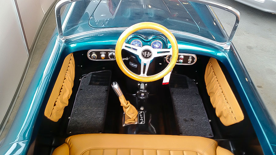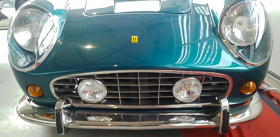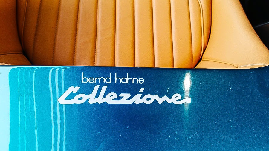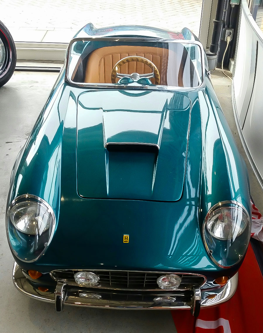 ‘Bernd Hahne colezione’ staat op deze Harrington Ferrari 250 California Spyder en de kenners weten dat dit een internationale coureur was die vroeger de racewereld kleur gaf. Dit Italiaanse raspaardje voelt zich goed thuis in de showroom van Auto Dijk in Dokkum tussen de Porsches en de topklasse wagens met het VW-logo op de neus.