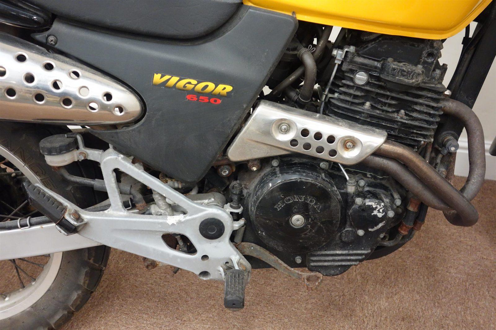 Goed. Zo vanaf 1990 waren de Honda Vigors gewoon de generatie allroads na de Yamaha XT500 en de Honda XL 500. Iets voor die tijd werd de naam overigens ook voor een compact soort sedan van Honda gebruikt. Maar deze Vigor heeft weer twee wielen. Zoals het hoort, Het is een basic motorfiets, en dan nog wel eentje van het soort dat zijn roots direct in de offroadhoek heeft. De dingen zijn zo smal als een enveloppe op zijn kant, je zit met de knieën zowat tegen de voorste knipperlichten en het blok is dus een 650 cc eencilinder met vier radiaal geplaatste kleppen. En dat wil dapper stampend best van zijn plek. Het ding weegt nog twee keer niks ook. In Nederland waren er maar verdraaid weinig dealers die er brood in zagen. Maar bij Arie Molenaar Motoren in het Utrechtse IJsselstein hebben ze vanaf 1927 ononderbroken bemoeienis in de motorfietswereld. Daar maakten ze een andere inschatting. Eentje waardoor ze bij Honda Nederland toch even een zakdoek over het voorhoofd haalden. Arie Molenaar kocht een stuk of veertig Vigors (Vigorren? Vigri?) in alle kleuren en de dingen gingen als warme broodjes de deur uit.
