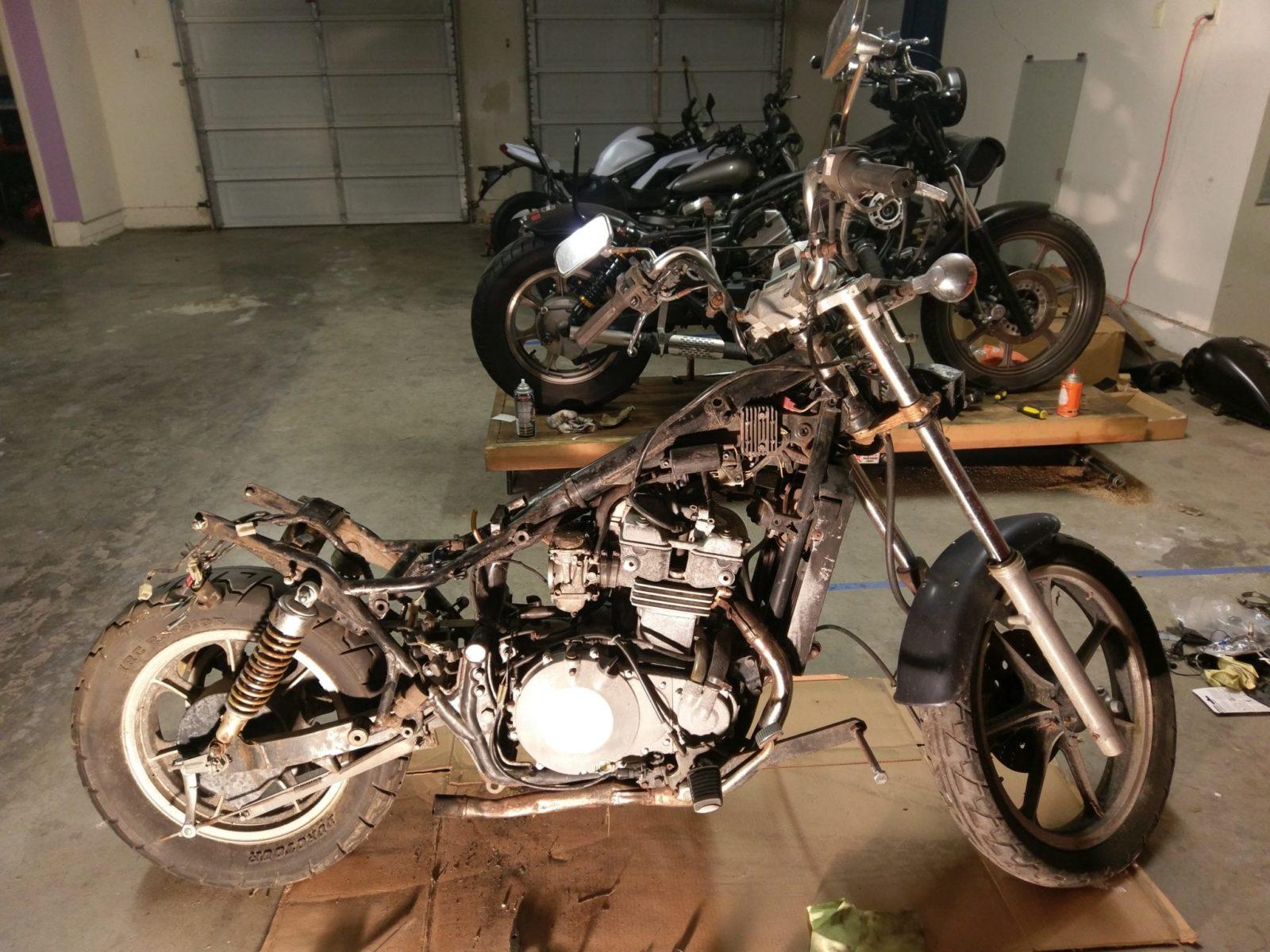 Als je de lelijke dingen zoals het zadel en de alu beugel daar achter demonteert en vervangt, dan is zo’n Kawasaki LTD 450 mogelijk een leuk non budget uitgangspunt voor de nieuwe generatie motorliefhebbers. Er is best een aardig bobbertje van te maken.