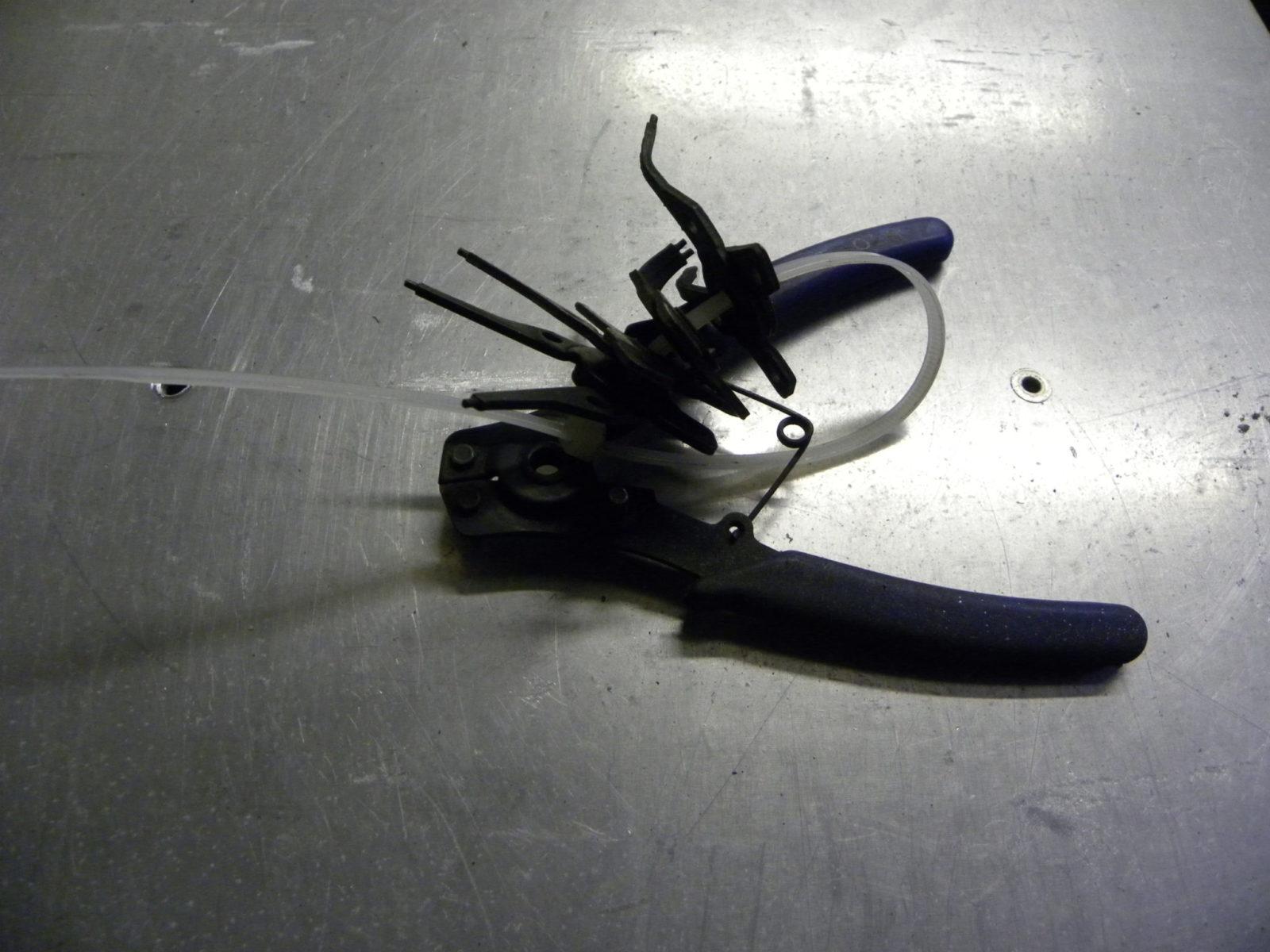 - Een klepveertang: omdat anders dat verdraaide spietje weg schiet en je tijden op een nieuwe moet wachten. Het is zo’n stuk gereedschap dat je mogelijk maar een keer in je sleutelbestaan nodig hebt. En dan loont het. Alle pogingen met lijmklemmen en verzaagde drukbusjes zijn gehannes.