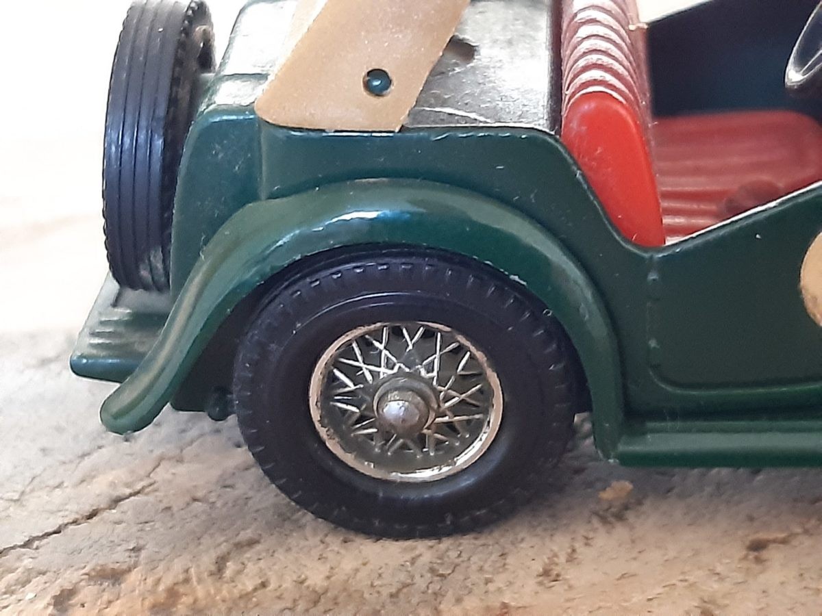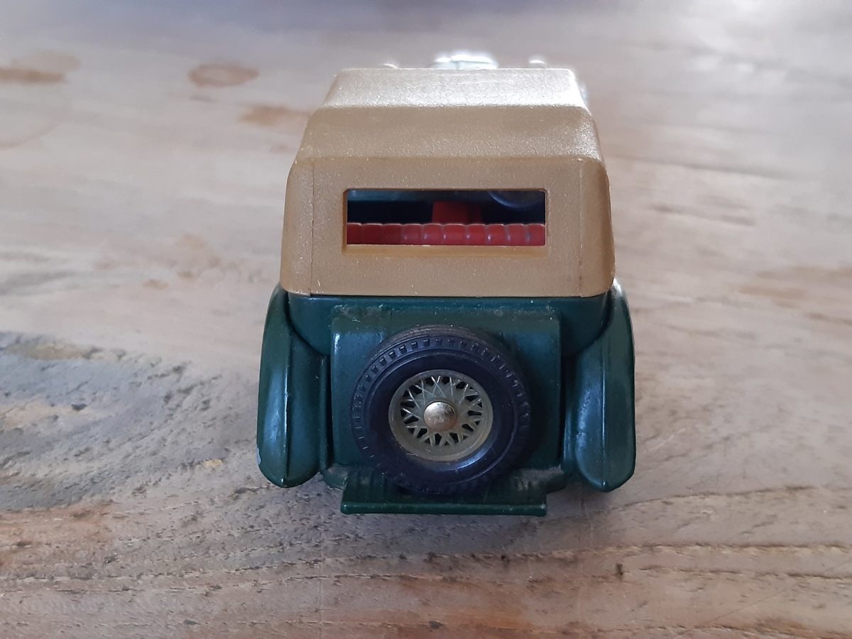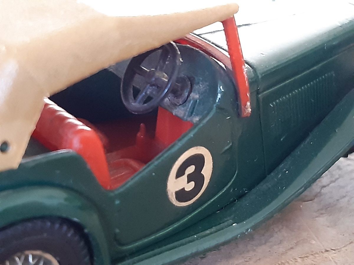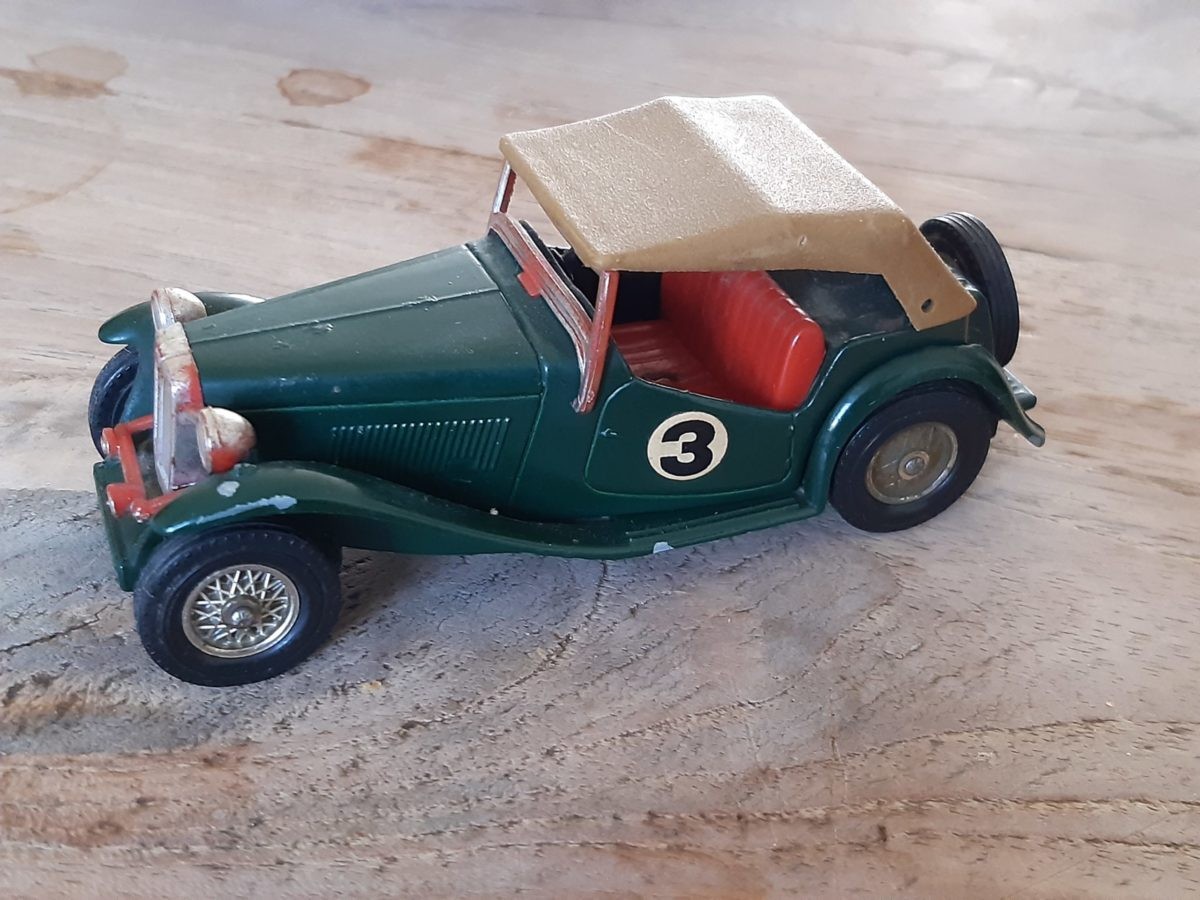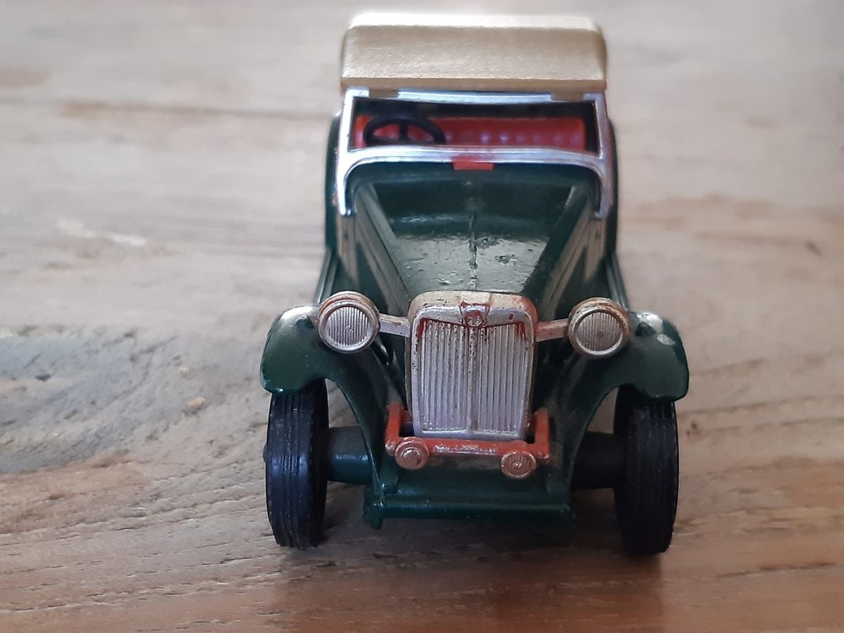 Een tijdje geleden stuitte ik in de kringloopwinkel bij toeval op MG TC Midget exemplaar. Met miniatuur patina. In het groen. Met een passend dakje en verkleurde spaakwielen. Met wedstrijdnummers op de zij flanken. Klaar voor de start. En zwaar genoeg uitgevoerd om de tand des tijds te overleven. Het autootje uit 1945 werd dus in 1978 op schaal gebouwd door Lesney. Toen was de MG TC ondanks de 32 verstreken jaren al echt yesteryear. En nu helemaal.