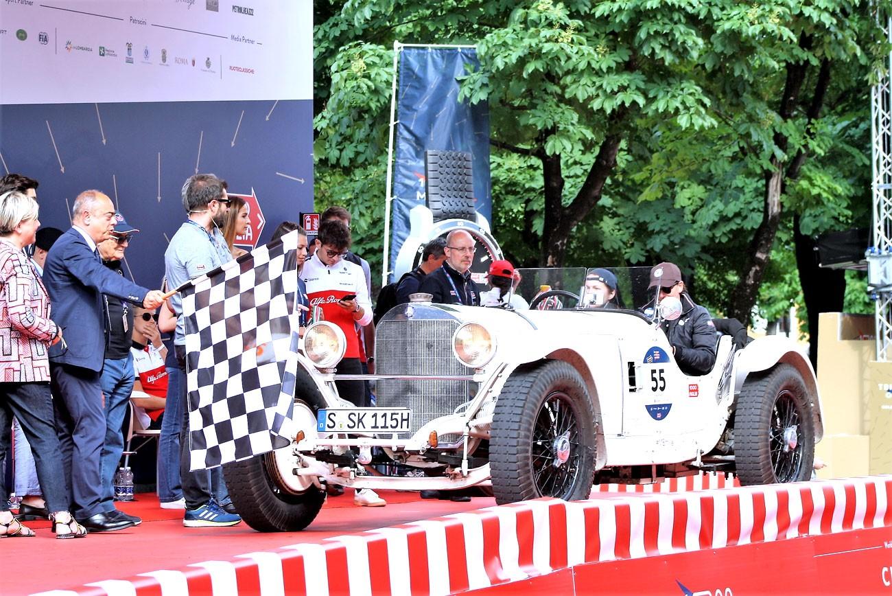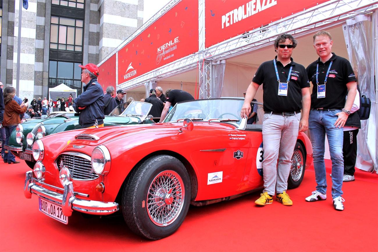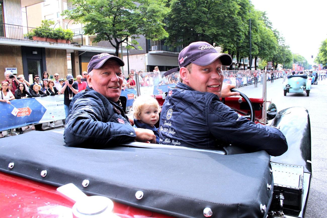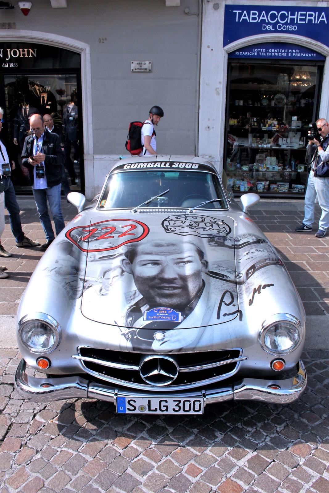 Tsja, deelnemers. Het zijn er de afgelopen jaren steeds meer geworden. Maar liefst 467 equipes gingen bij deze editie van start. Eigenlijk vindt iedere autoliefhebber in het deelnemersveld wel iets van zijn gading. Natuurlijk veel Italiaanse volbloeds van merken als Alfa Romeo, Ferrari en Maserati, maar ook bijvoorbeeld een brede range aan prachtige modellen van Fiat origine. Zeker de wat kleinere modellen van dat merk, als de Balilla en Topolino kunnen steevast rekenen op de steun en aanmoediging van het publiek. Mercedes is prominent aanwezig. Men koestert het historische record uit 1955 toen Stirling Moss met een Mercedes 300 SLR de race wist af te leggen in 10 uur 7 minuten en 48 seconden. Een gemiddelde snelheid van bijna 160 kilometer per uur. Over landwegen… In Brescia herinnerde een bont met het gezicht van Stirling Moss beschilderde “Flügeltür”, voorzien van moderne techniek, aan deze heroïsche prestatie. Dat de Mille Miglia in Nederland populair is zie je aan het grote aantal Nederlandse deelnemers en bezoekers. Dit jaar namen onder meer de AMK-redacteuren Perry Snijders en Martin Utberg deel. Martin zelfs als navigator van oud-formule I coureur en Le Mans winnaar Jochen Mass. In nummer 7 van AMK lees je een interview met Martin over zijn avontuur. Het kan niet altijd tegenzitten ☺.