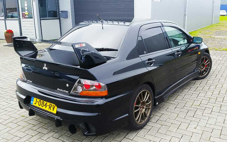 Mitsubishi Lancer Evolution 8 (2003) van Albert van der Meer. Gitzwarte krachtpatser.