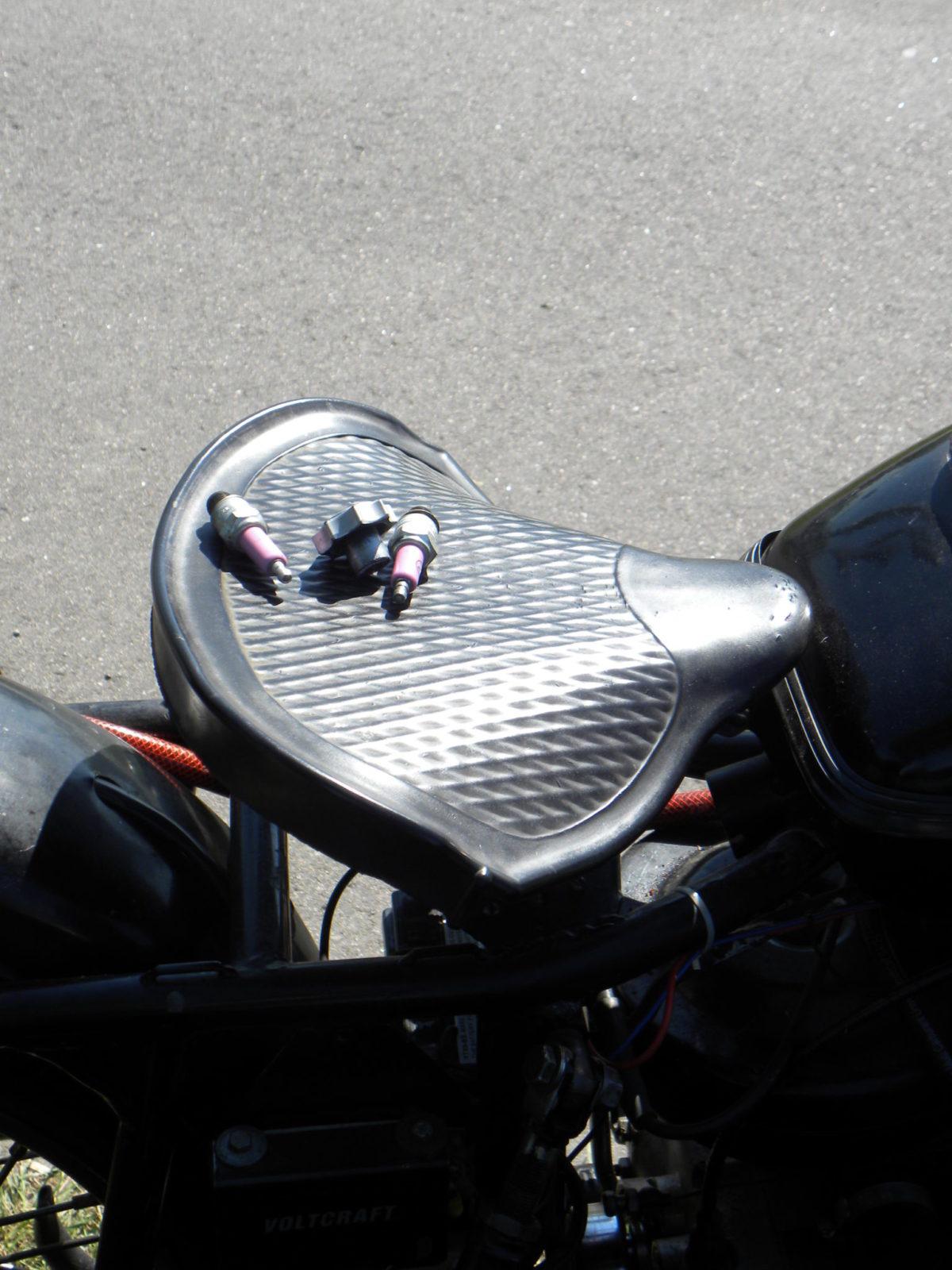 Aan de voorzichtig ingeschatte kant zaten er ook nog wat sleutelstops in de rit. De Moto Guzzi hield zich vlekkeloos. Maar voor de Ural was het de eerste lange rit na zij wedergeboorte. En het ding werd erg heet. En hij pingelde als een gek. Dus werd de ontsteking zo op het gevoel wat later gezet. Maar de boxer bleef erg heet worden. Ook nadat de ontsteking nog later was gezet. De carterontluchting van de Ural was al eerder omgebouwd naar ‘vrij uitademen’ op de klassiek Britse manier: vanaf de carter ontluchting liep de ontluchtingsslang nu naar het achterspatbord. En de piloot van de achter rijdende Moto Guzzi ( want het is een goede gewoonte dat de traagste motor voor rijdt) meldde dat er bij de Ural meer oliedamp uit de carterontluchting kwam dan rook uit de uitlaat.