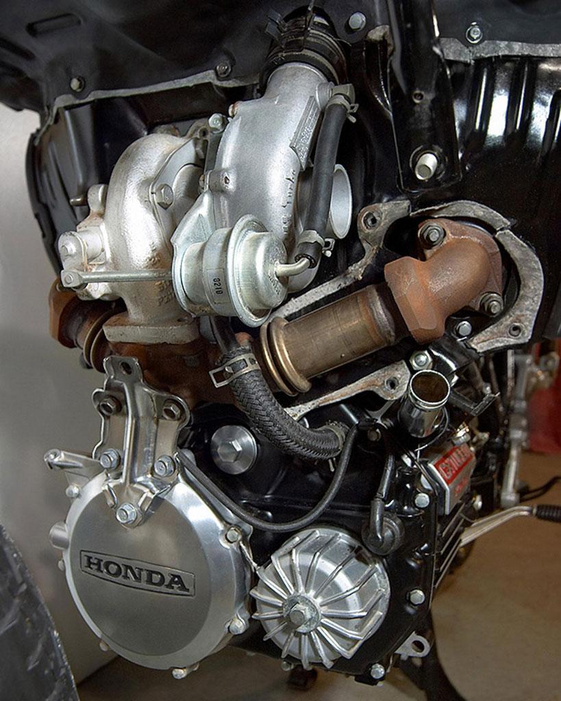Maar als er bij een Honda CX500 Turbo de zweep over ging, dan werd hij heel erg dorstig. Dat kan natuurlijk te maken hebben met het feit dat de Turbo geen drie, maar vier kleppen in elke kop had en dat de carburateurs waren vervangen door inspuiting. Maar de gashand van de piloot speelde ook dapper mee in dat proces. Het hele – mede door Nippon Dense – bedachte inademingstraject met al zijn sensoren leverde in het begin aardig wat problemen op. Een viertal druk-sensoren en een aantal temperatuur voelers geven signalen door aan de CFI computer die daaruit de dosering berekend. En dat ging niet altijd even goed, ondanks het feit dat deze computer al uitgerust was met een zelfdiagnose systeem