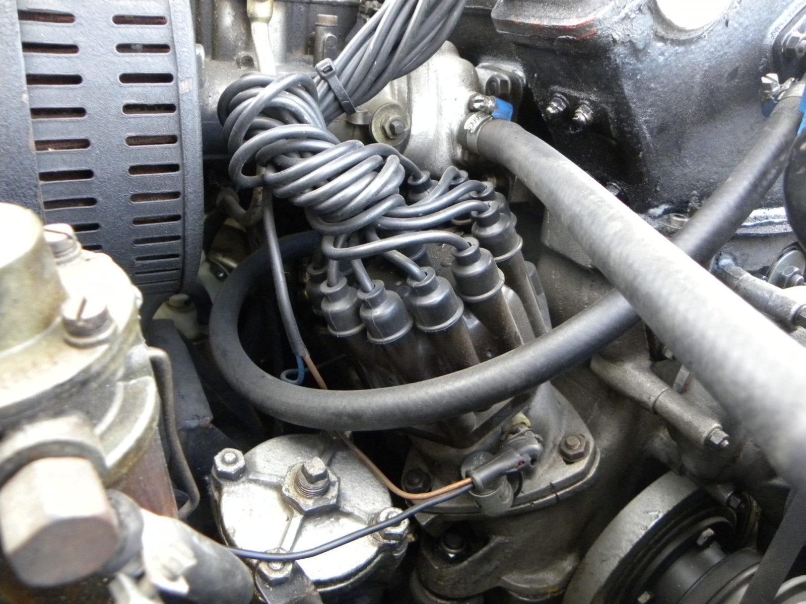 Vanaf de verdelerkap loopt een gezinsportie spaghetti naar de twee bougies per cilinder. Elk elektron dat van af daar naar de bougies gaat moet zijn reis juichend afleggen. Heerlijk. De zwarte krimplak is natuurlijk niet alleen thermisch verantwoord, maar draagt ook bij aan de indrukwekkend dreigende uitstraling van dat technische stuk beeldhouwwerk onder de kap.