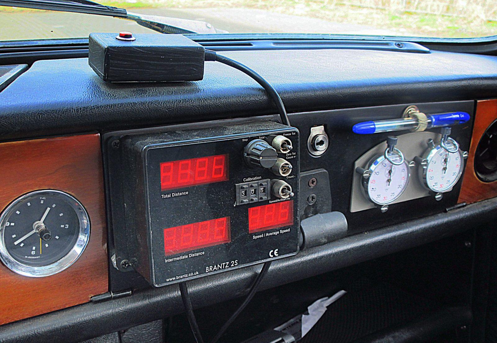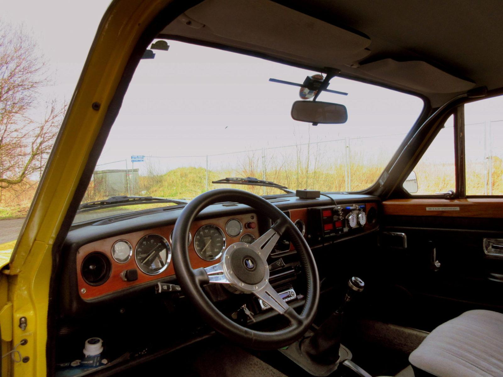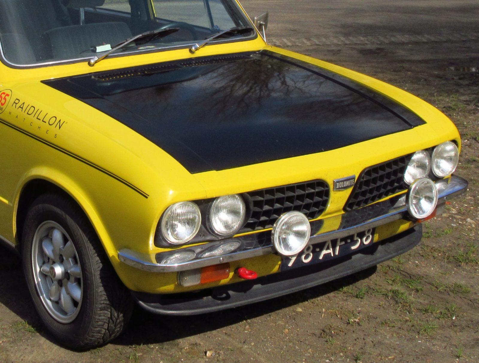 De Triumph Dolomite van Nan Beers -in 1973 in Nederland geleverd- zorgt ook bij ons voor de nodige voorpret. En wanneer Nan Beers de poorten van zijn loods opent worden wij heel blij. Onmiddellijk constateren wij dat de buitenzijde van de charismatische Dolomite, naast de nodige chromen details, sportieve accenten toont. Alloy wheels (Minilite) en de combinatie van geel met zwart verraden de tijdens de ingrijpende restauratie aangebrachte sportieve dresscode van de jaren zeventig. Verder is de 1850 (onder meer) voorzien van een setje extra verlichting én de frontspoiler van de Dolomite Sprint. Binnen deze Triumph bevinden zich- naast de nodige luxe accenten- ook verwijzingen naar de rallyactiviteiten die Nan Beers met zijn Triumph Dolomite ontplooit. Zo werden een dubbele stopwatch en een trip master aan boord van de Engelsman gemonteerd. Het van huis uit grotere stuurwiel werd vervangen door een klein Moto Lita stuurwiel.