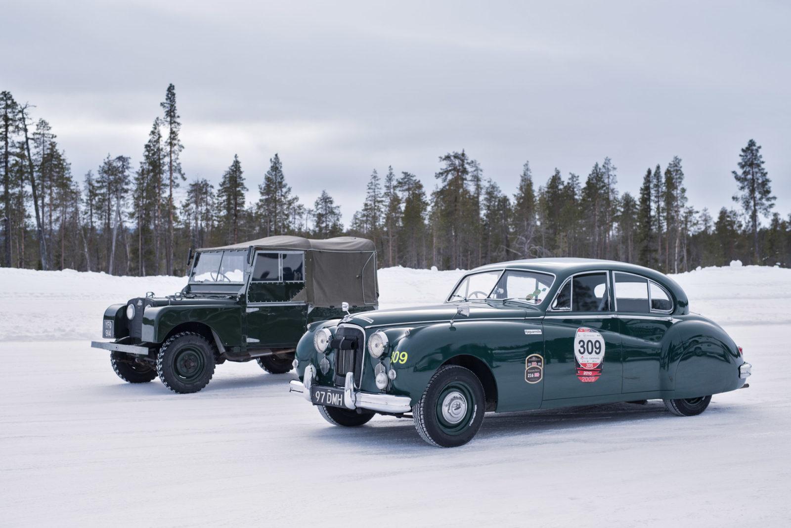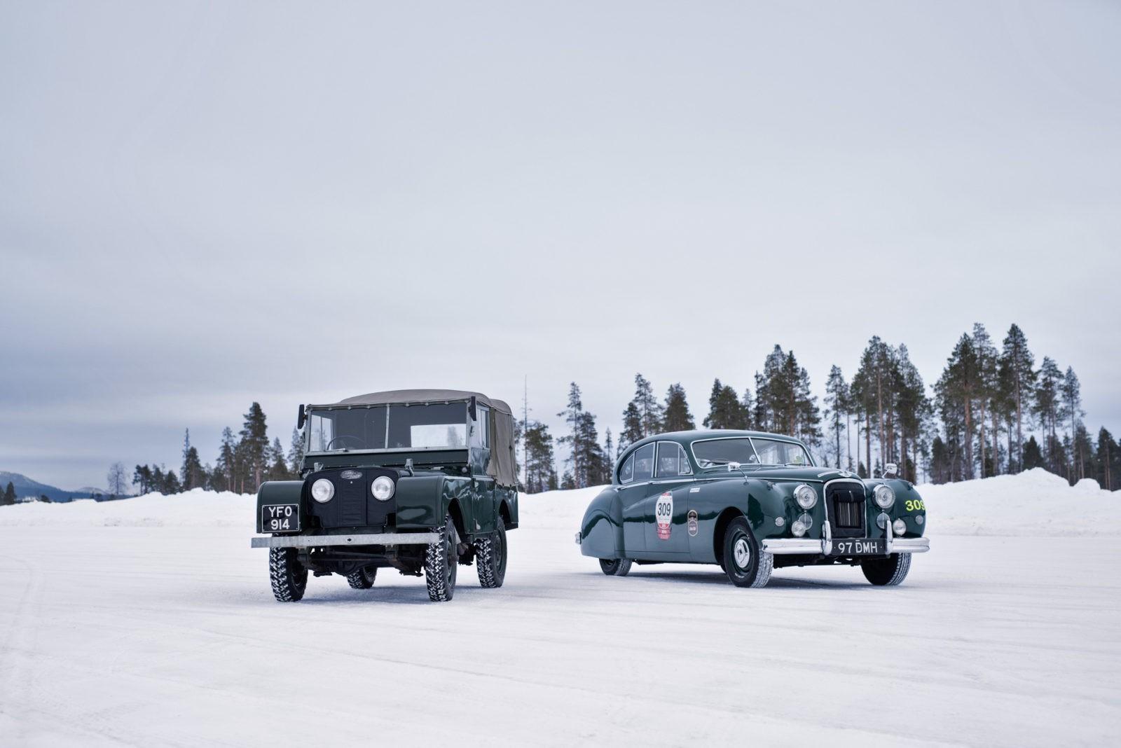 Op het ijs rijden met klassieke Jaguars en Land Rovers