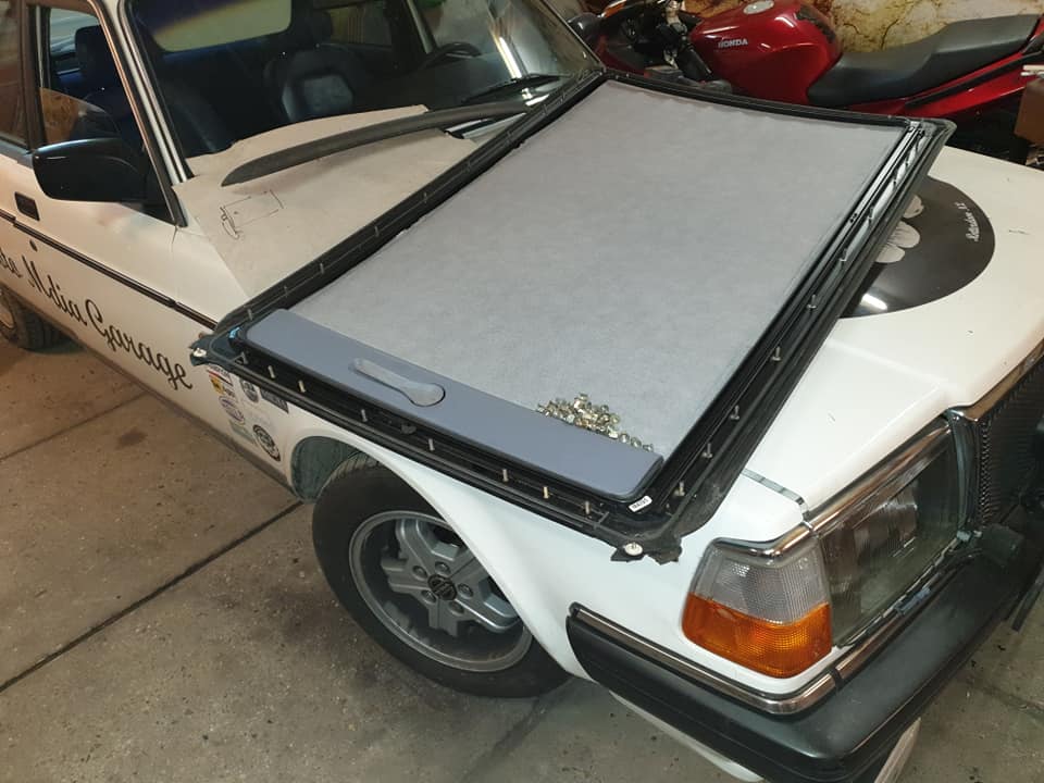 En die Volvo 240 werd in verband me de komende, zonniger tijden voorzien van een open dak. Nu zijn er een paar gerenommeerde aanbieders van klassieke open daken. Maar bij MotoMidia gingen ze voor de top: open is goed. Opener is beter. Het enorme Renault Twingo dak is intussen voorbeeldig gemonteerd en bewezen stormvast. Maar de klus was zo arbeidsintensief dat er voorlopig geen positieve reacties worden gegeven op de vraag “Kunnen jullie dat bij mijn auto ook doen?”