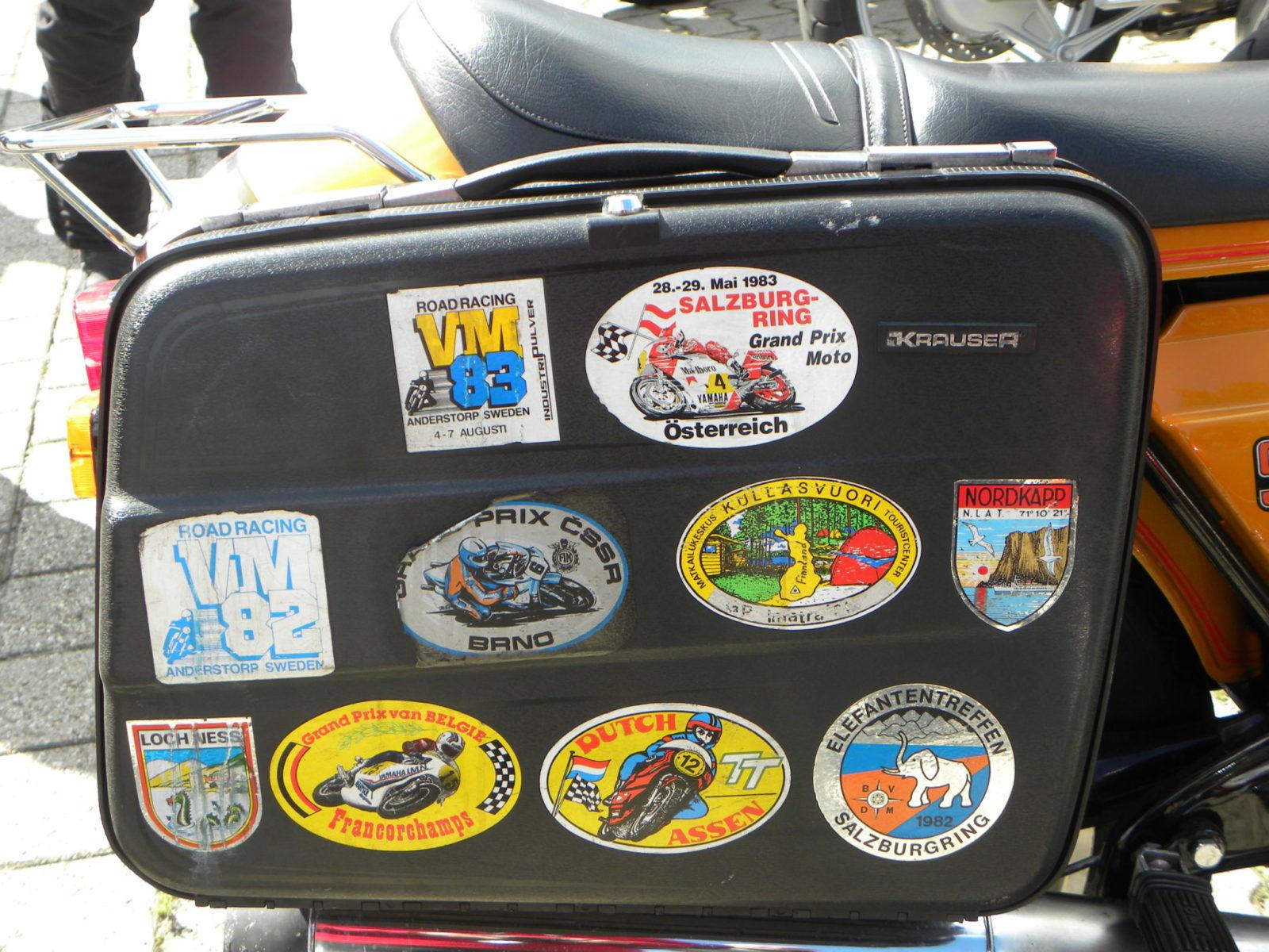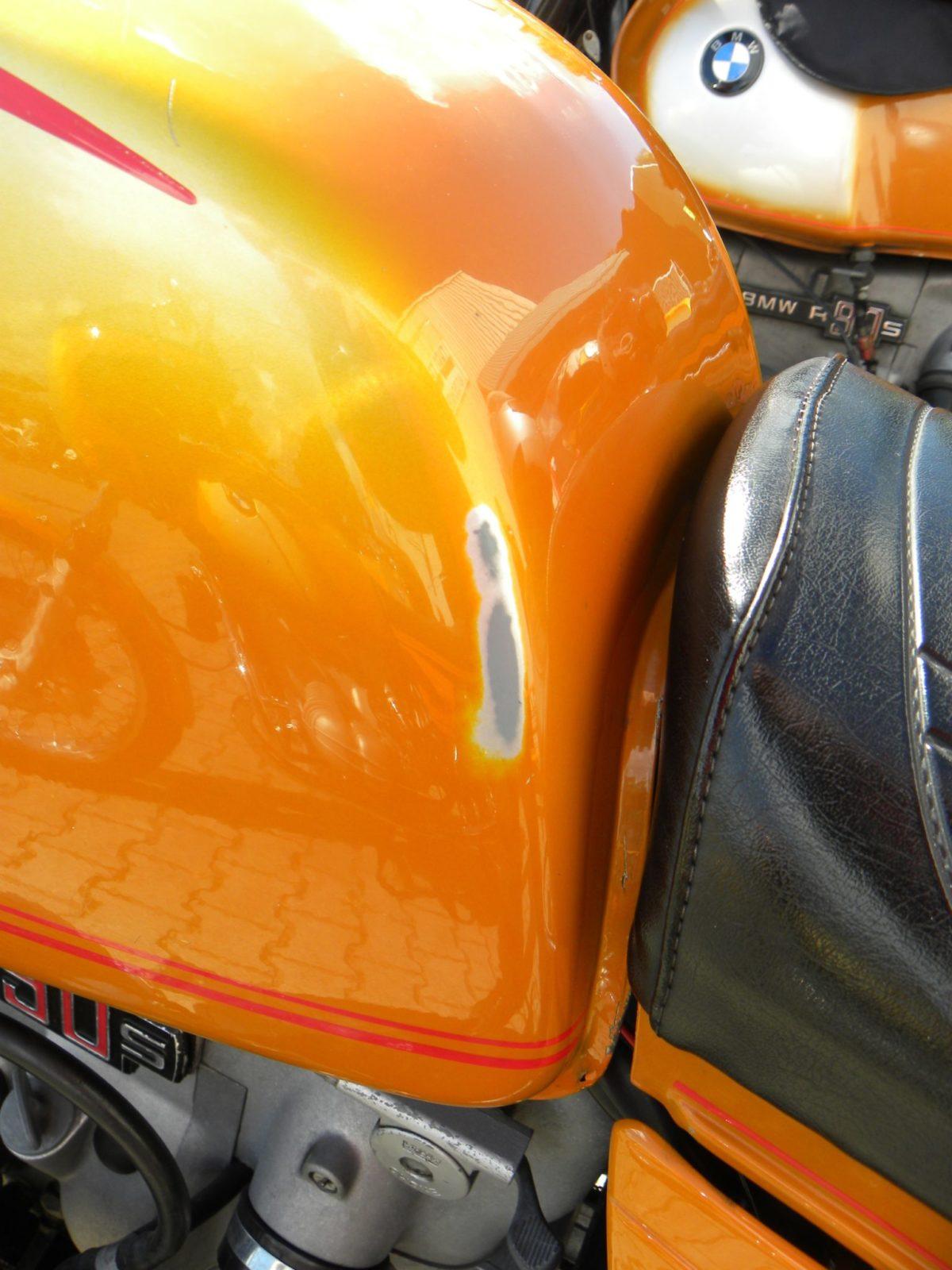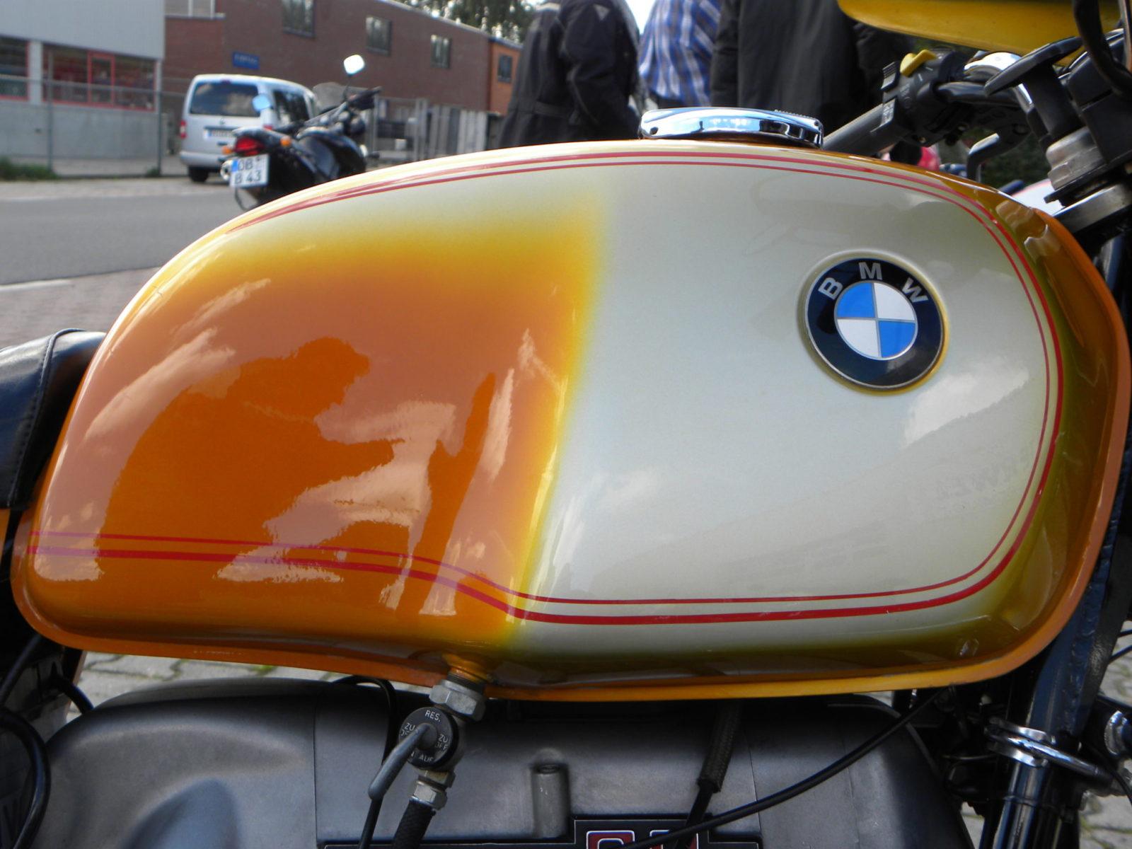 Intussen maakte niemand zich zichtbare zorgen over het feit dat de betreffende motor een verzonken tankdop had… In vertederende tegenstelling daarmee: een door en door originele ‘Silberrauch’ kleurige R90S die er uitzag alsof hij net succesvol was ingezet bij de slag van Arnhem en de meest recente Paris Dakar plus een Daytona oranje exemplaar waar de onbezorgde eigenaar wat laswerk aan het frame had gedaan – of laten doen. Waarom? De ‘Elephantentreffen’ stickers op de koffers verklaarden het: ’s winters kreeg het Beierse raspaard een zijspan aangeknoopt. Van dat idee werden er ook weer een paar mensen erg nerveus.