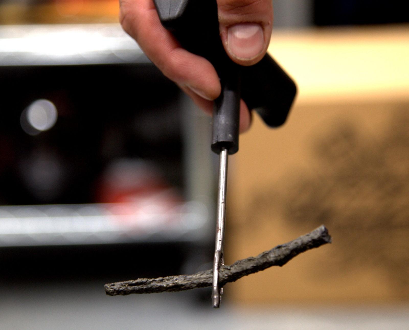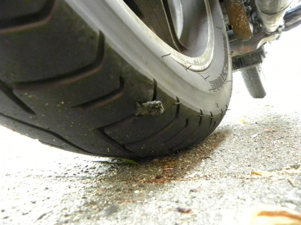 Na verwijderen van de indringer die de band lek had geprikt werd de ‘veter’ volgens de gebruiksaanwijzing in het gat gestoken. Klaar! De band had de schroef die hem lek had gemaakt blijkbaar in een bocht opgepikt. De zelftapper zat niet in het volle loopvlak, maar meer in de schouder van de band. Een later aangesproken bandenspecialist zei dat het venijn hem in de locatie van mijn reparatie zat. Op de locatie van de perforatie zit beduidend minder rubbermassa dan op het volle loopvlak. Het ‘pluggen’, het insteken van de van vulcanisatiemiddel voorziene rubber veter, zou op schouder of flank van een band gevaarlijk kunnen zijn in verband met het te weinig aan ‘draagvlak’ voor de reparatie. Hij vertelde dat hij de band niet had mogen repareren. Volgens zijn voorschriften was het een volle afkeur.