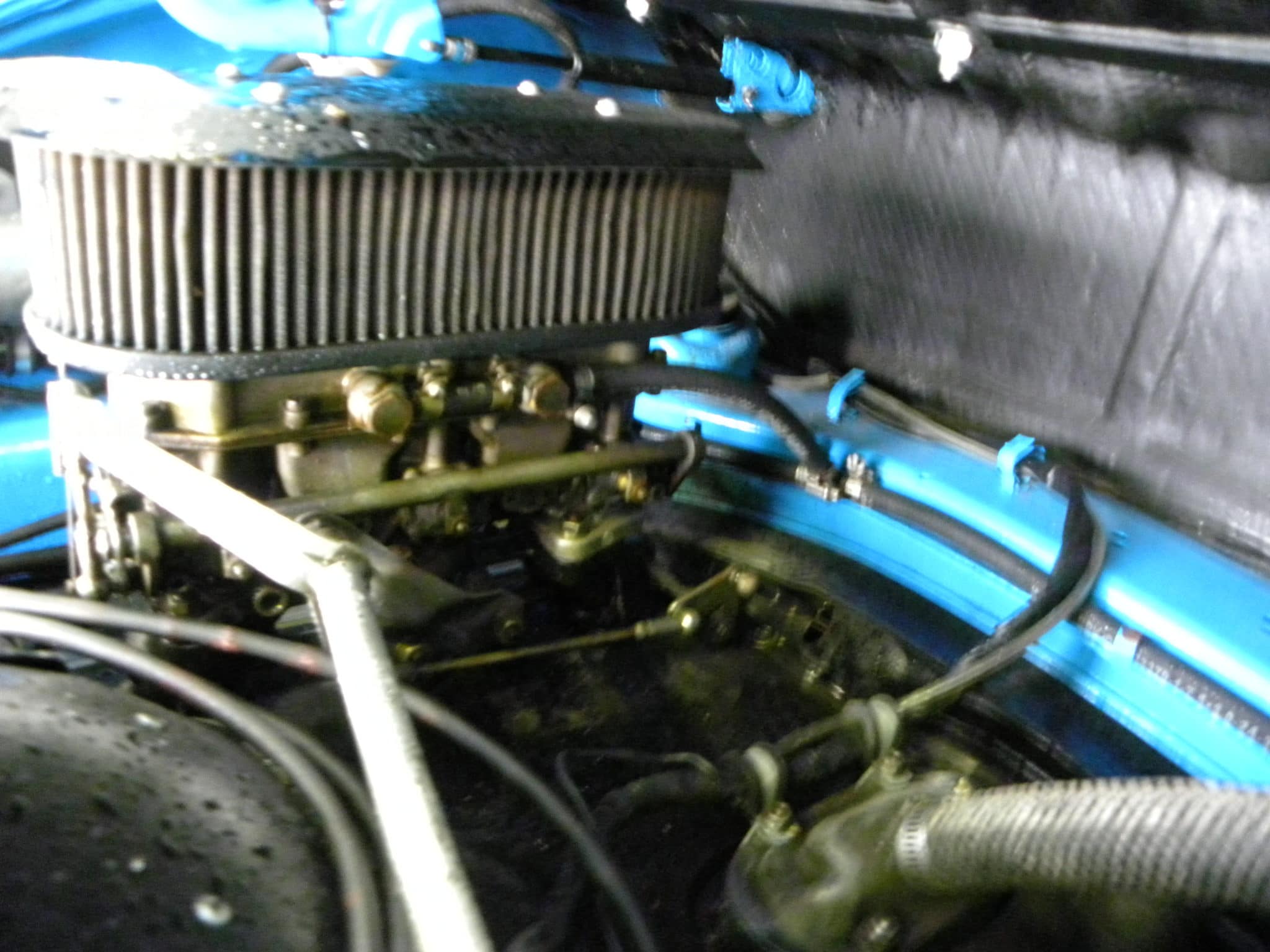 En onder de motorkap van zo’n no nonsens sportieveling, zo’n ADHD’er met zes cilinders is het leven overzichtelijk. Mannelijk stoer, nadrukkelijk mechanisch technisch en daarom juist zo overzichtelijk. We zien de ventilator, twee enorme luchtfilters en de carburateurs.