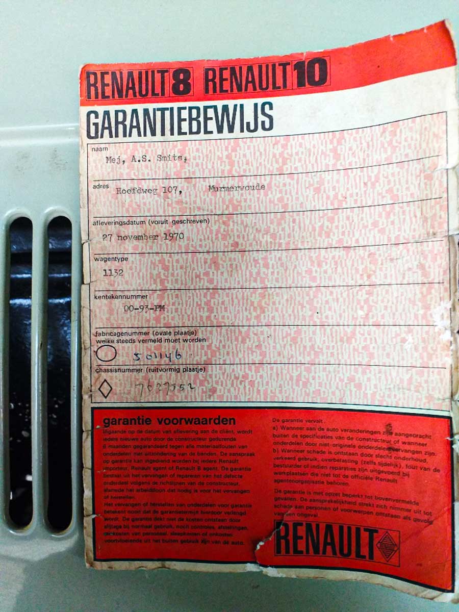 Rob: “Ik heb de Renault uiteindelijk gekocht bij Renault garage Dijkstra in Leeuwarden waarbij hij eerder was bestemd om in de Renault verzameling terecht te komen. Ik vond de Renault 8 een fantastisch model en kon mijn enthousiasme nauwelijks beheersen. Maar gelukkig wel de afspraak maken dat bij eventuele verkoop ik als eerste gebeld zou worden. De plannen werden gewijzigd, er moest ruimte komen waarbij ik tot mijn grote verrassing toch werd gebeld om tot zaken te komen. De koop werd snel gesloten met als bonus voor mij een hele serie Renault 8 onderdelen, en wat ook bijzonder was: Het garantiebewijs van de eerste eigenaar bij de aankoop in 1970 zat erbij. Ik moet wel eerlijk bekennen dat de Renault 8 daarna 8 jaar op mijn aandacht heeft gewacht. Wel kocht ik al eerder een Gordini motorblok van 1400 en dubbele webers.”