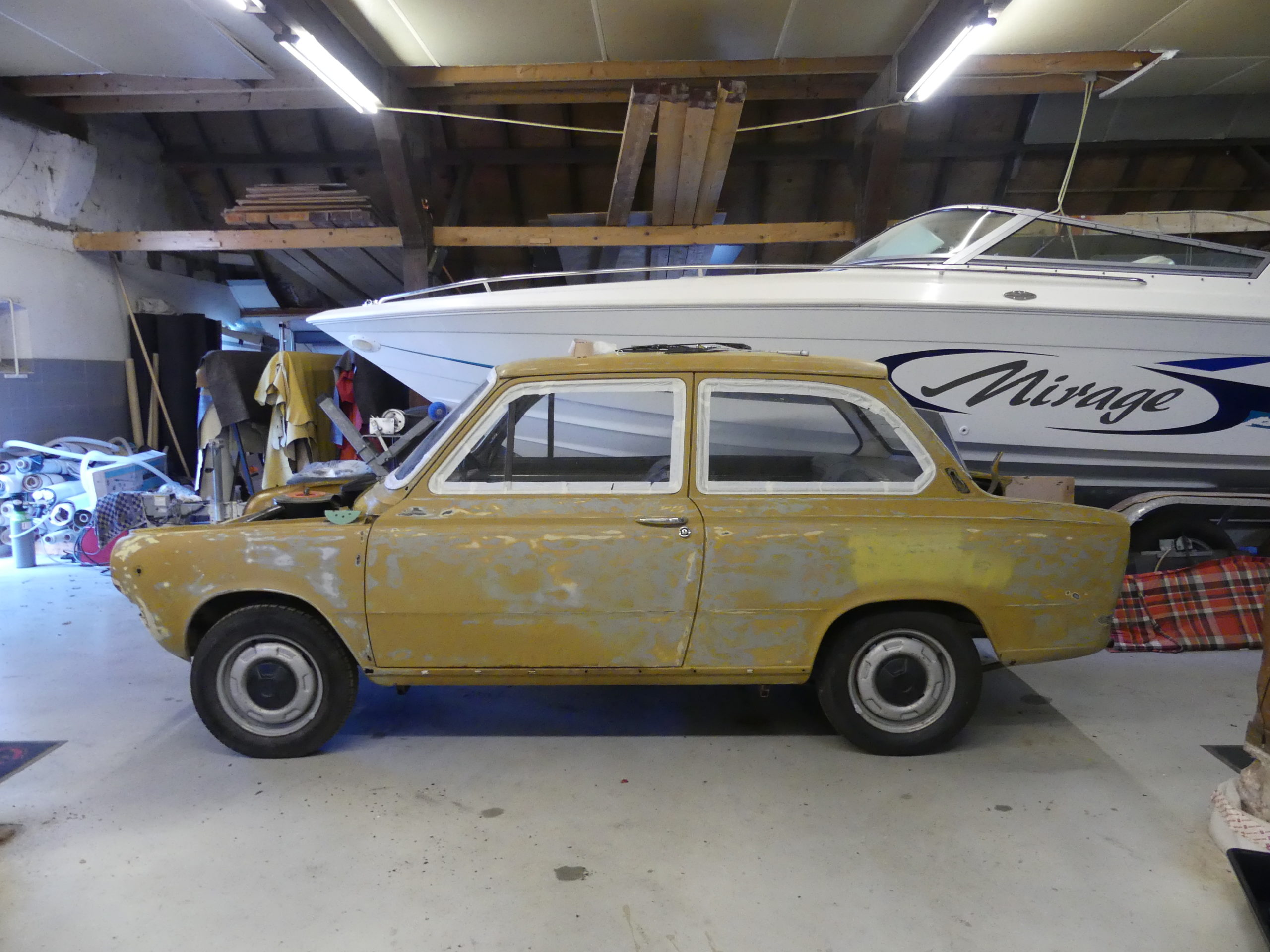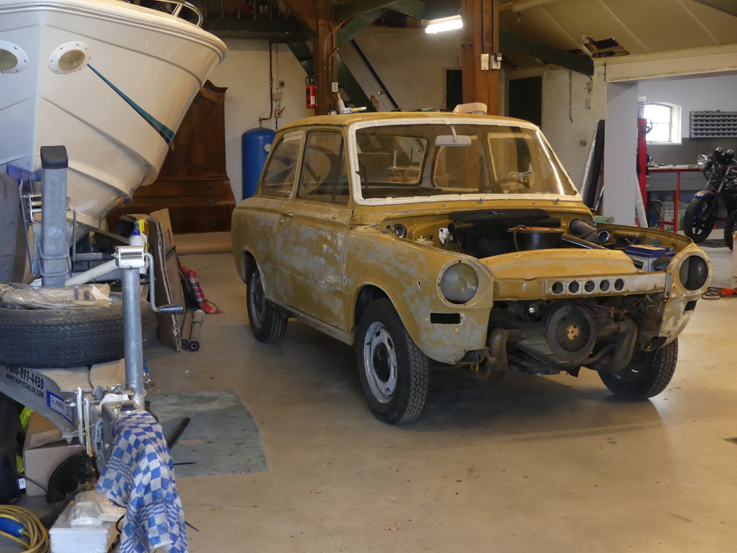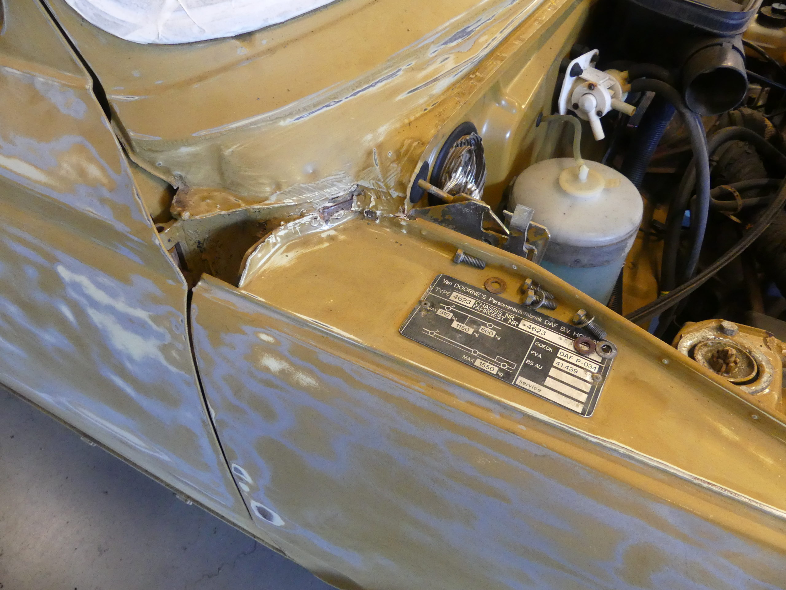 Het Dafje op de foto vonden we bij vriend Norbert. Die redt uit passie leuke autootjes en knapt ze op voor zo weinig mogelijk geld. En deze vertederende klassieker is bijna klaar om gerold te worden. Hij wordt geel, misschien met een wit dak. De blauw/groene kleurstalen zijn in serieus intern overleg afgekeurd.
