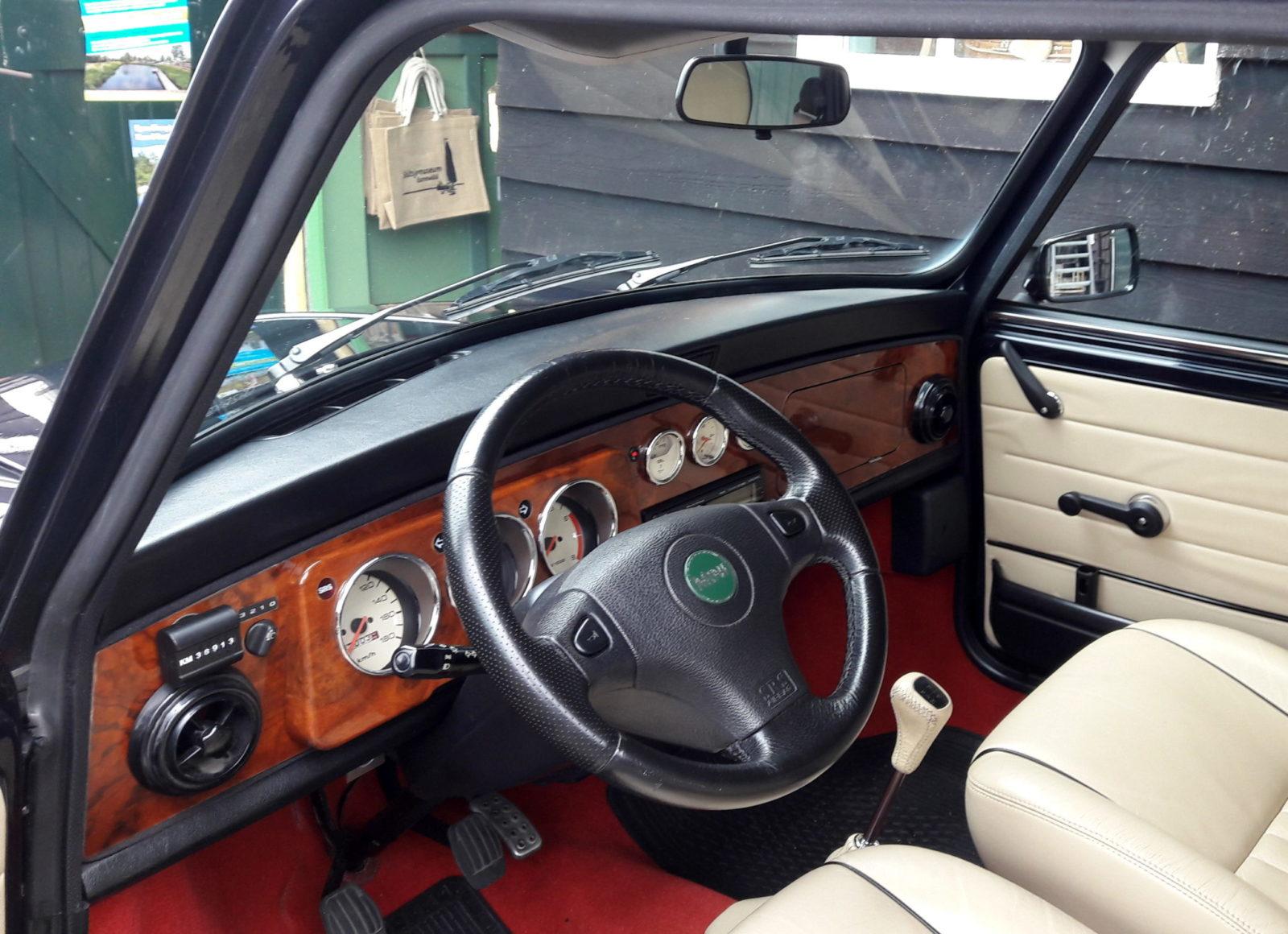 In de auto, die in fraai donker antraciet is gespoten, vond meubilair met mooi en speels geprofileerd crèmekleurig leer zijn weg. Het past goed binnen het interieur, dat toch al een tamelijk behaaglijke indruk achterlaat. Hout, meters met chromen randen en een lederen stuurtje met airbag appelleren aan de Rover afkomst. Het inzittenden compartiment is simpelweg chique en frivool afgewerkt. Het verwelkomt de passagiers van de Mini op een levendige en typisch Britse wijze in een gemoedelijke atmosfeer.
